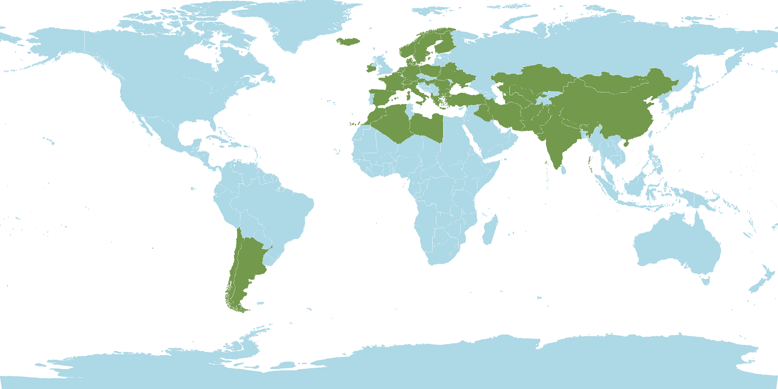 - World Distribution : Afghanistan, Albania, Alberta, Algeria, Altay, Argentina, Arizona, Arkansas, Austria, Baltic States, Belarus, Belgium, Bhutan, British Columbia, Bulgaria, Buryatiya, Central European Rus, Chile, China, Chita, Colorado, Corse, Czechoslovakia, Denmark, East European Russia, Finland, France, Føroyar, Germany, Great Britain, Greece, Greenland, Hungary, Iceland, Idaho, India, Inner Mongolia, Iowa, Iran, Iraq, Ireland, Italy, Kazakhstan, Kirgizstan, Krasnoyarsk, Krym, Labrador, Lebanon-Syria, Libya, Manitoba, Mongolia, Montana, Morocco, Nebraska, Nepal, Netherlands, Nevada, New Brunswick, New Mexico, Newfoundland, North Caucasus, North Dakota, North European Russi, Northwest European R, Norway, Ontario, Oregon, Pakistan, Palestine, Poland, Prince Edward Island, Qinghai, Québec, Romania, Sardegna, Saskatchewan, Sicilia, South Dakota, South European Russi, Spain, Sweden, Switzerland, Tadzhikistan, Tibet, Transcaucasus, Turkey, Turkey-in-Europe, Turkmenistan, Tuva, Ukraine, Utah, Uzbekistan, Washington, West Siberia, Wisconsin, Wyoming, Xinjiang, Yugoslavia
