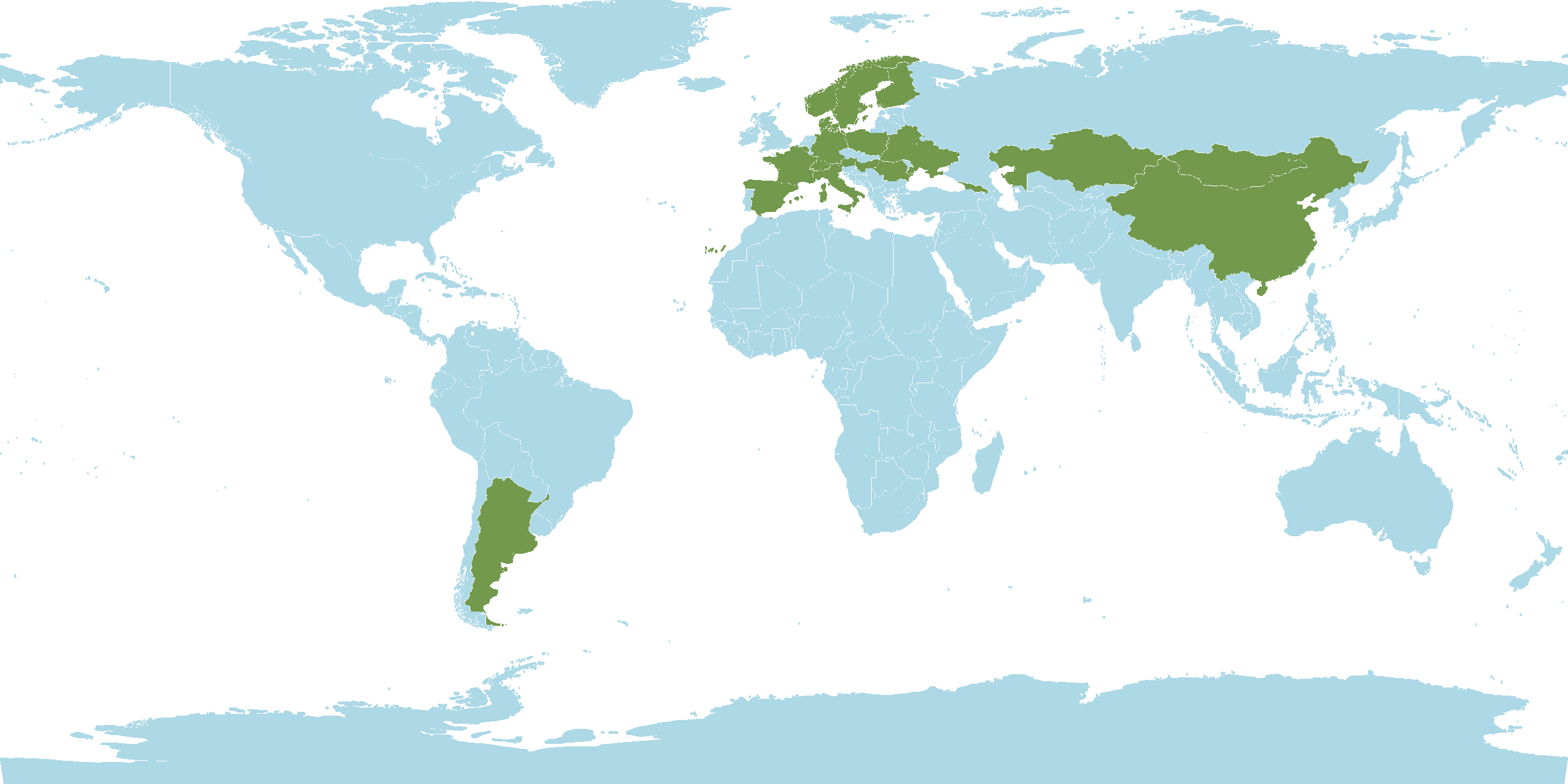 - World Distribution : Subarctic America to North Mexico and Altay, Amur, Argentina, Austria, Baltic States, Belarus, Belgium, Buryatiya, European Rus, China, Chita, Colorado, Czechoslovakia, Denmark, Finland, France, Germany, Hungary, Illinois, Inner Mongolia, Irkutsk, Italy, Kamchatka, Kazakhstan, Khabarovsk, Korea, Krasnoyarsk, Krym, Magadan, Manchuria, Mongolia, North Caucasus, Norway, Poland, Primorye, Romania, Sakhalin, Sicilia, South European Russi, Spain, Sweden, Switzerland, Tadzhikistan, Tennessee, Tuva, Ukraine, Vermont, West Siberia, Yakutskiya