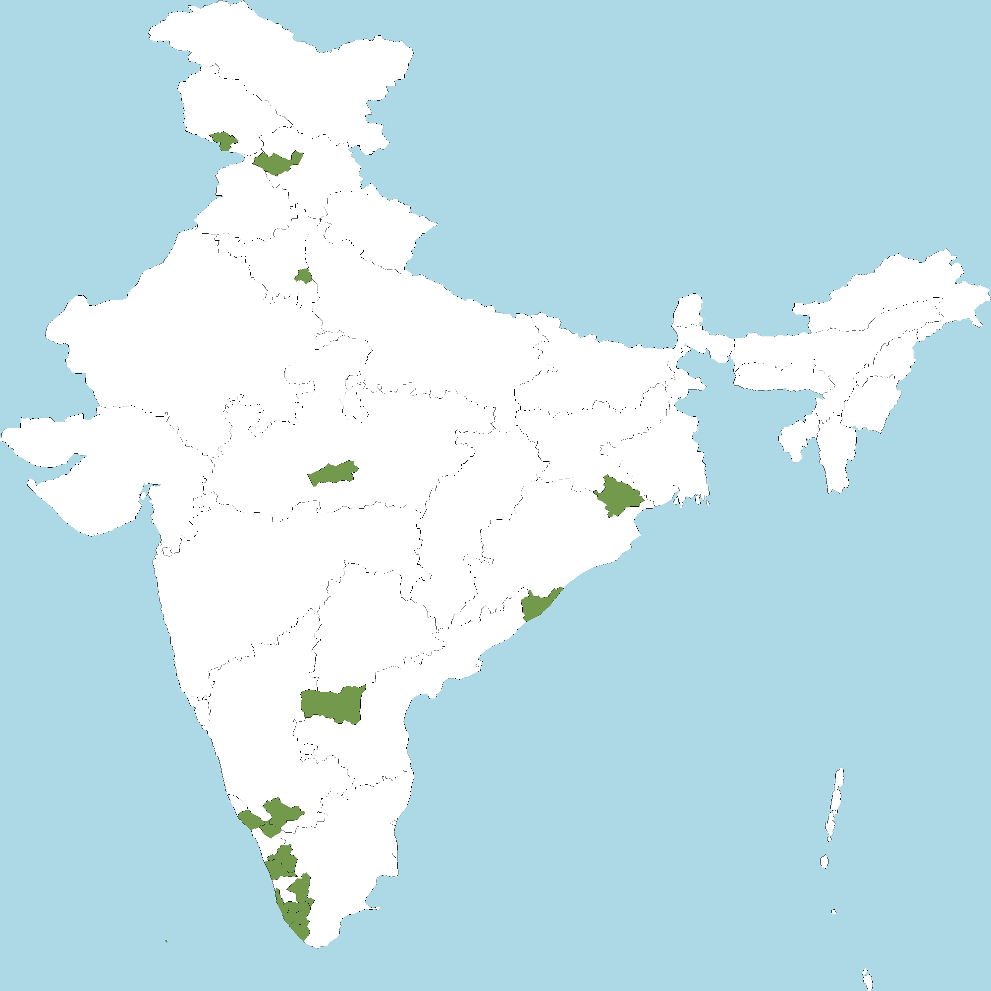 - Kerala : Kannur district, Wayanad district, Palakkad district, Thrissur district, Idukki district, Alappuzha district, Pathanamthitta district, Kollam district, Thiruvananthapuram district