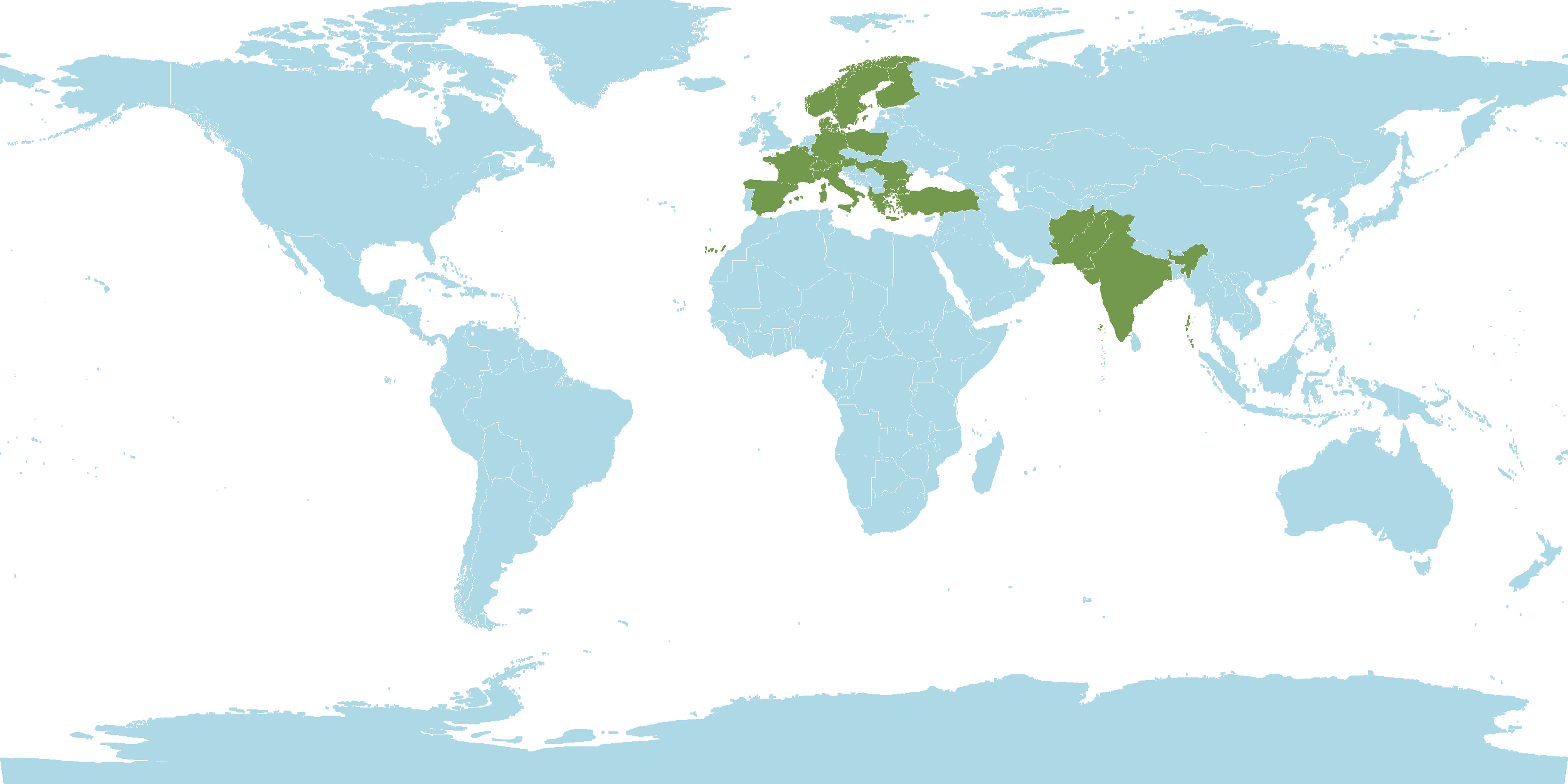 - World Distribution : Afghanistan, Albania, Austria, Baltic States, Belgium, Bulgaria, Central European Russia, China North-Central, Corse, Czechoslovakia, Denmark, East European Russia, Finland, France, Germany, Greece, Hungary, India, Inner Mongolia, Italy, Kirgizstan, Korea, Krym, Manchuria, North Caucasus, Northwest European Russia, Norway, Pakistan, Poland, Qinghai, Romania, Spain, Sweden, Switzerland, Transcaucasus, Turkey, Xinjiang, Yugoslavia