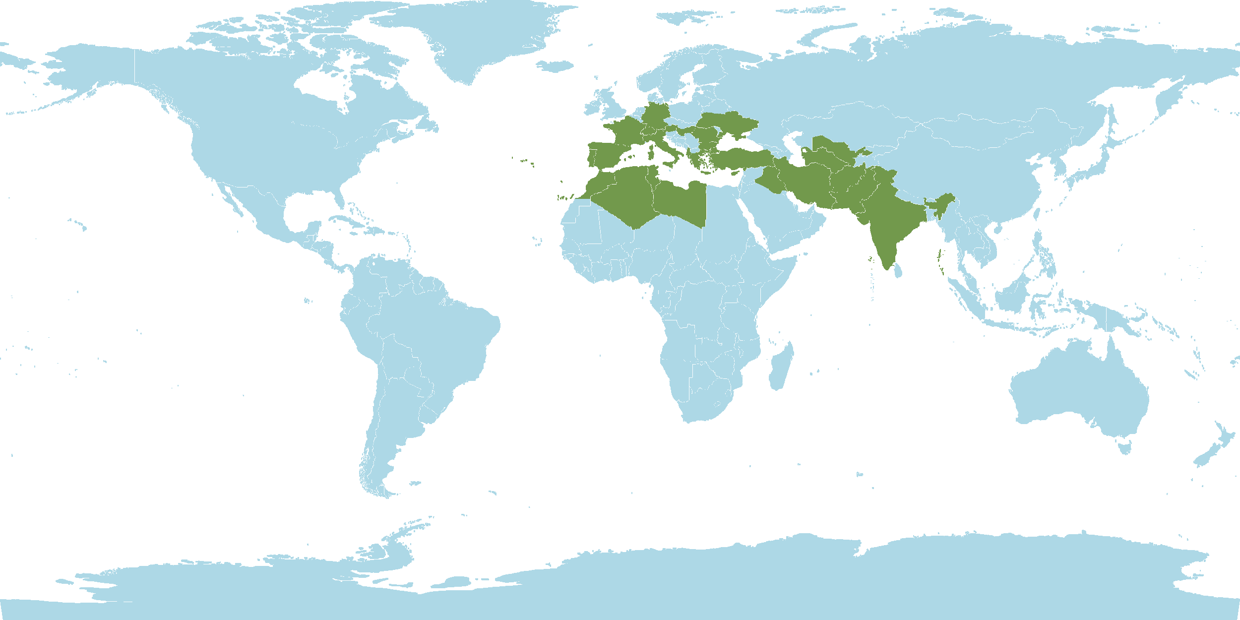 - World Distribution : Afghanistan, Albania, Algeria, Austria, Bulgaria, Cyprus, Czechoslovakia, East European Russia, France, Germany, Greece, Hungary, India, Iran, Iraq, Italy, Kirgizstan, Kriti, Krym, Lebanon-Syria, Libya, Morocco, North Caucasus, Pakistan, Palestine, Portugal, Romania, Sicilia, South European Russia, Spain, Switzerland, Tadzhikistan, Transcaucasus, Tunisia, Turkey, Turkey-in-Europe, Turkmenistan, Ukraine, Uzbekistan, Xinjiang, Yugoslavia
