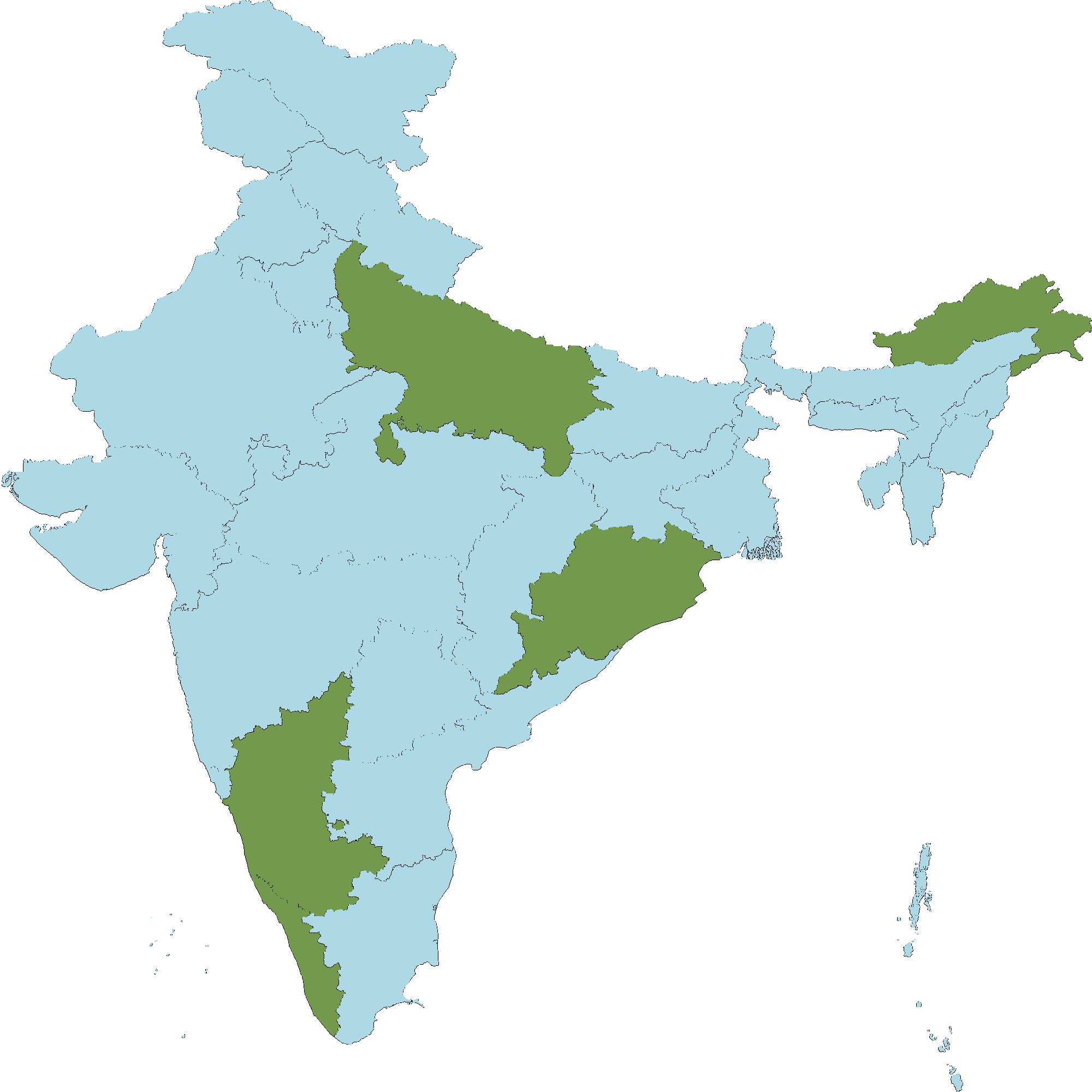 • Kerala : Wayanad district, Malappuram district, Palakkad district, Thrissur district, Idukki district, Kollam district, Thiruvananthapuram district