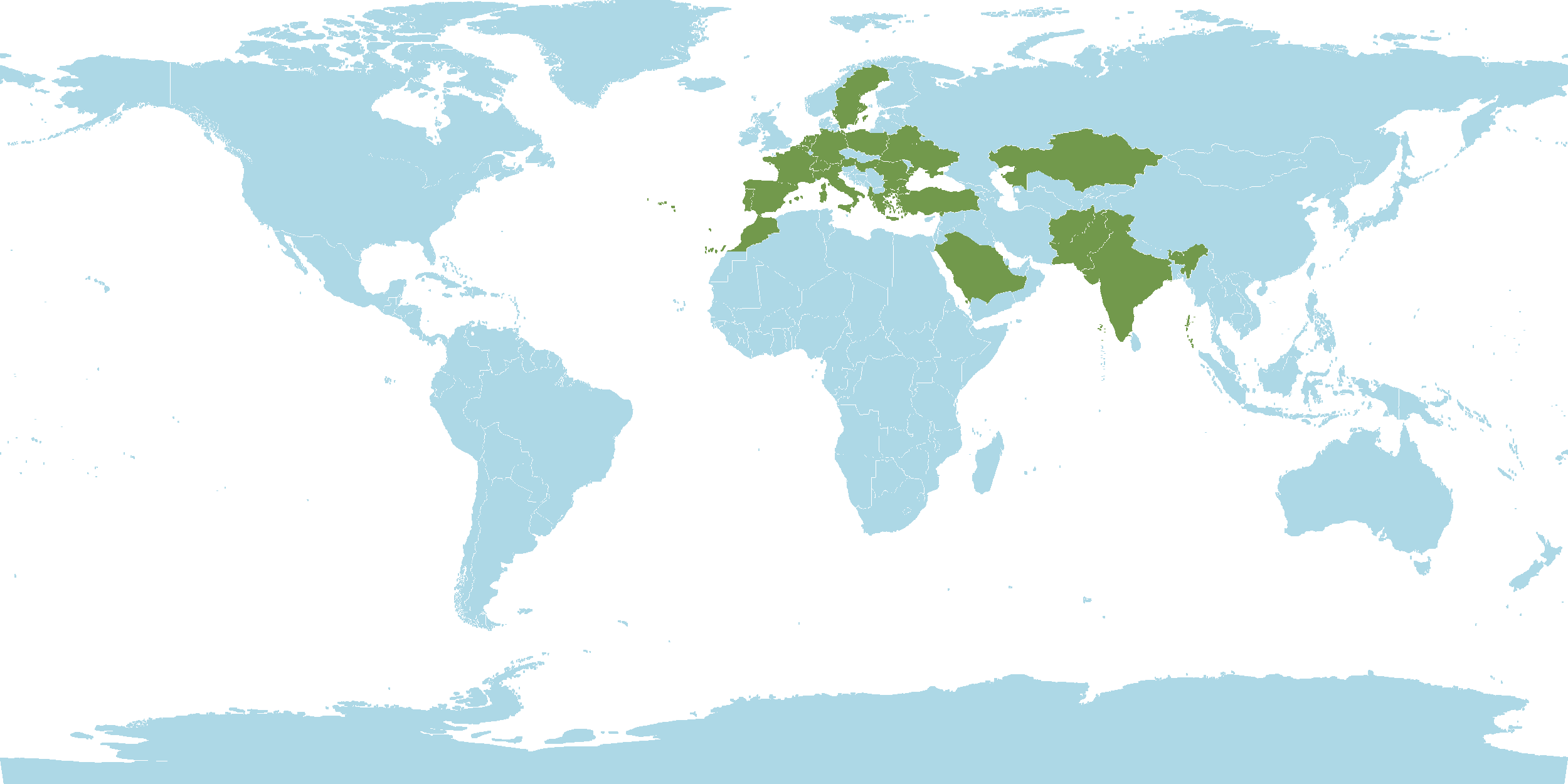- World Distribution : Afghanistan, Albania, Altay, Austria, Baltic States, Belarus, Belgium, Bhutan, Bulgaria, Central European Russia, Corse, Czechoslovakia, East European Russia, France, Germany, Greece, Hungary, India, Italy, Kazakhstan, Krym, Morocco, Netherlands, North Caucasus, Pakistan, Poland, Portugal, Romania, Saudi Arabia, South European Russia, Spain, Sweden, Switzerland, Transcaucasus, Turkey, Turkey-in-Europe, Ukraine, West Siberia, Xinjiang, Yugoslavia