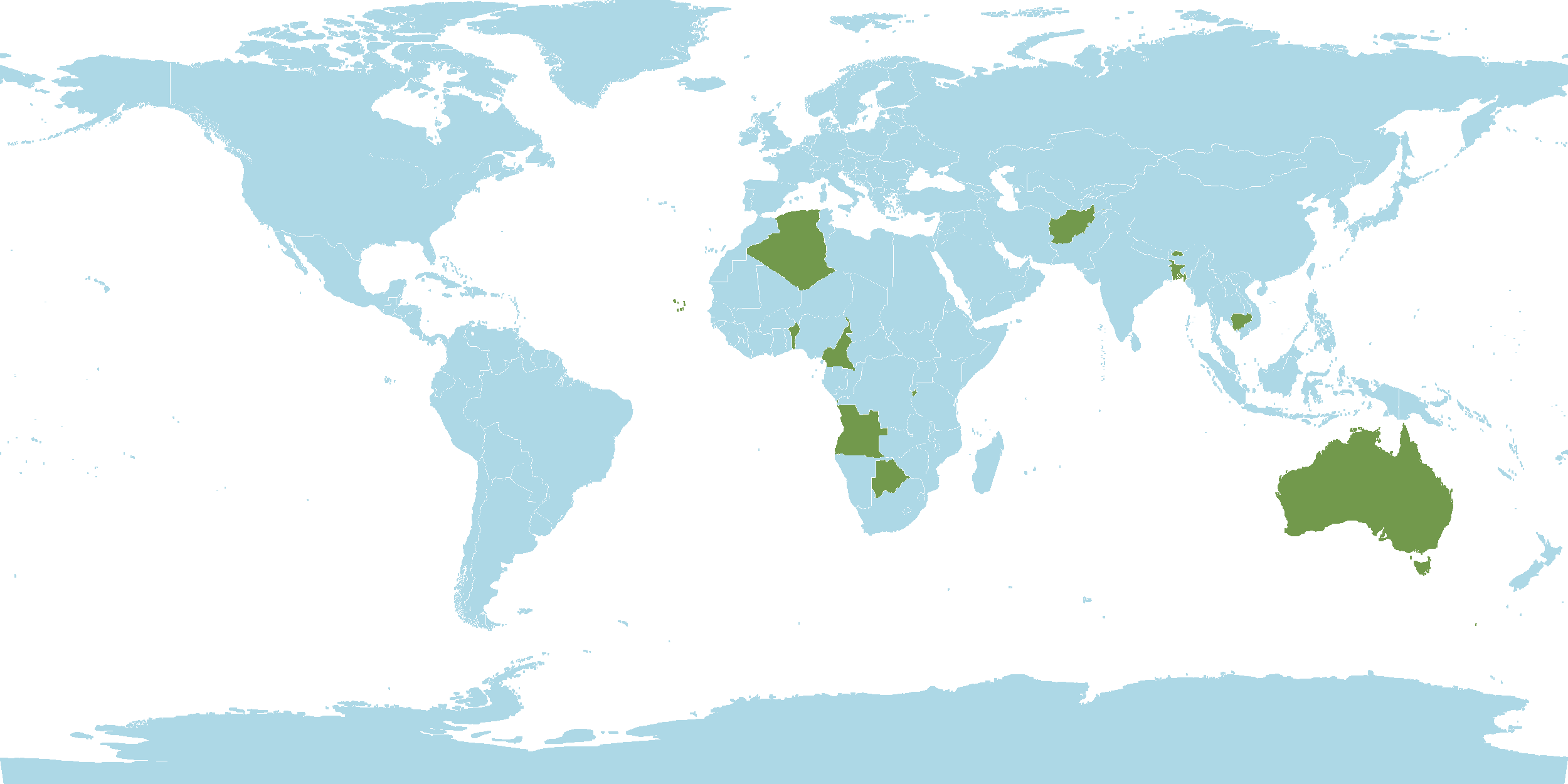 - Native : Afghanistan, Aldabra, Algeria, Andaman and Nicobar Islands, Angola, Australia, Azores, Bangladesh, Benin, Bhutan, Bismarck Archipelago, Borneo, Botswana, Burkina, Burundi, Cambodia, Cameroon, Canary Islands, Cape Provinces, Cape Verde, Caroline Islands, C