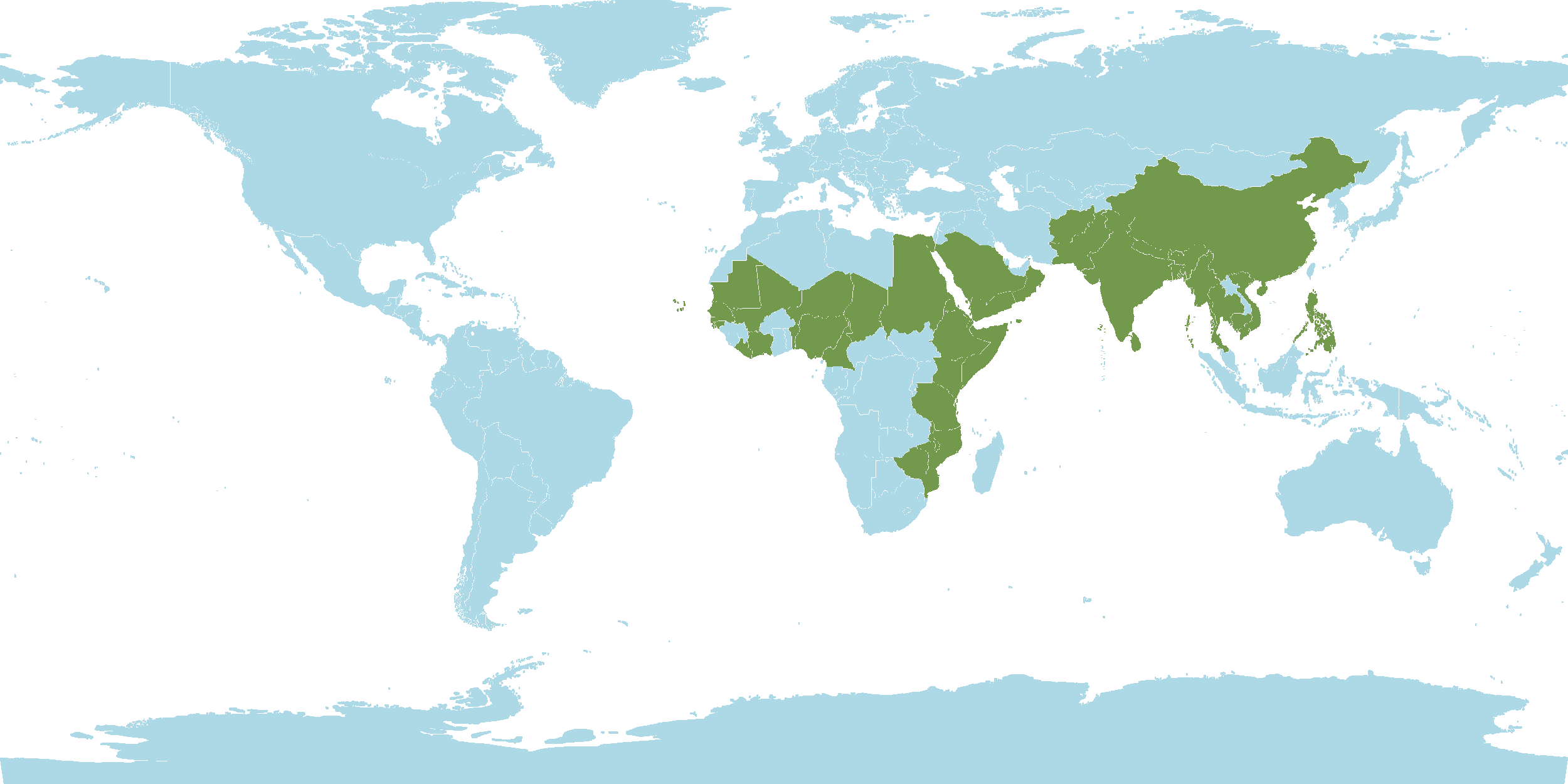 - Native : Afghanistan, Andaman and Nicobar Islands, Bangladesh, Benin, Bhutan, Burkina, Cambodia, Cameroon, Cape Verde, Chad, China, Djibouti, Egypt, Eritrea, Ethiopia, Gambia, Guinea-Bissau, Gulf States, Hainan, India, Ivory Coast, Jawa, Kenya, Lesser Sunda Island