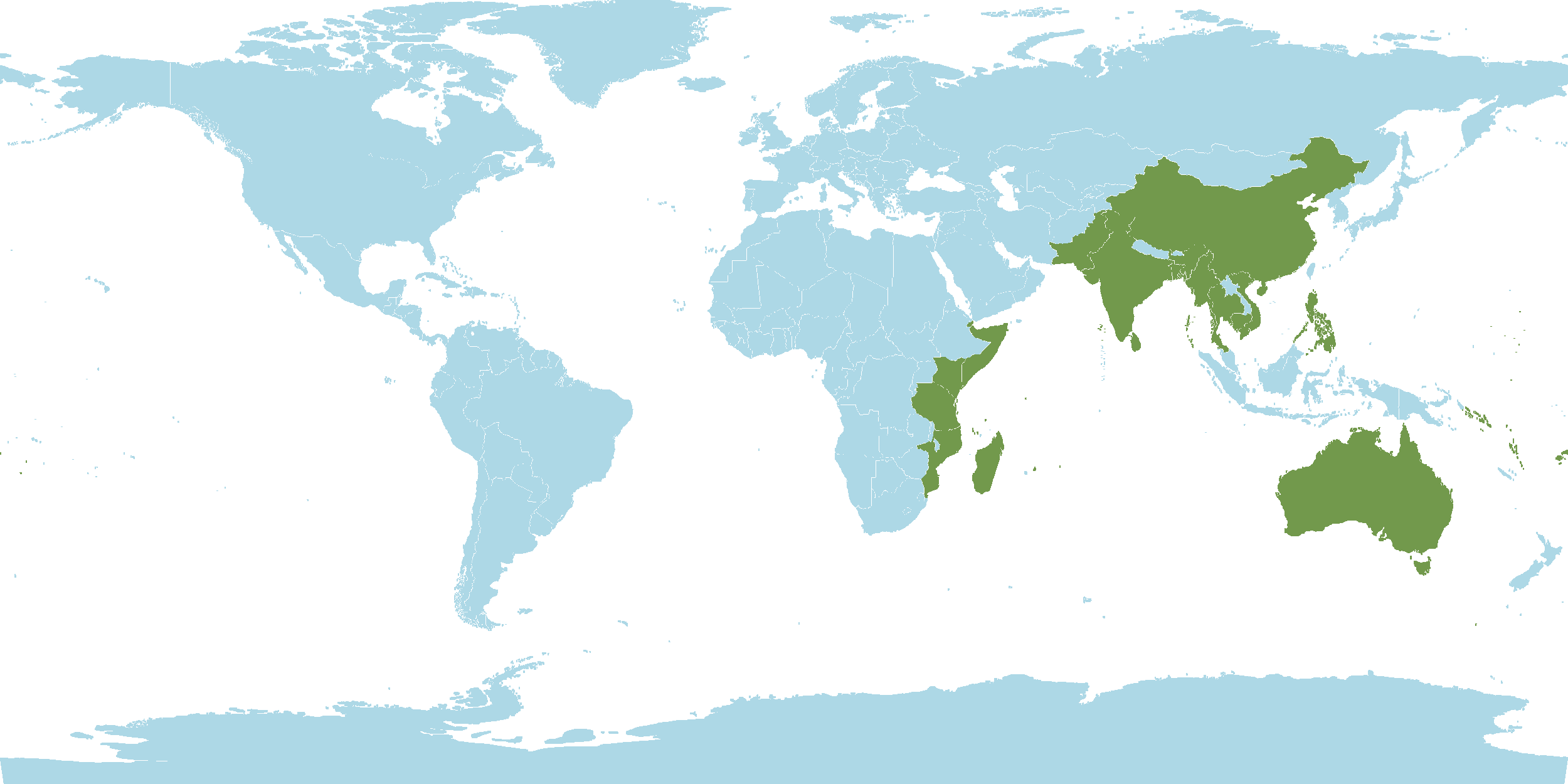 - Native : Aldabra, Andaman and Nicobar Islands, Australia, Bangladesh, Borneo, Cambodia, Cape Provinces, Caroline Islands, China, Christmas Island, Comoros, Djibouti, Fiji, Gilbert Islands, Hainan, India, Jawa, Kenya, KwaZulu-Natal, Lesser Sunda Islands, Madagascar