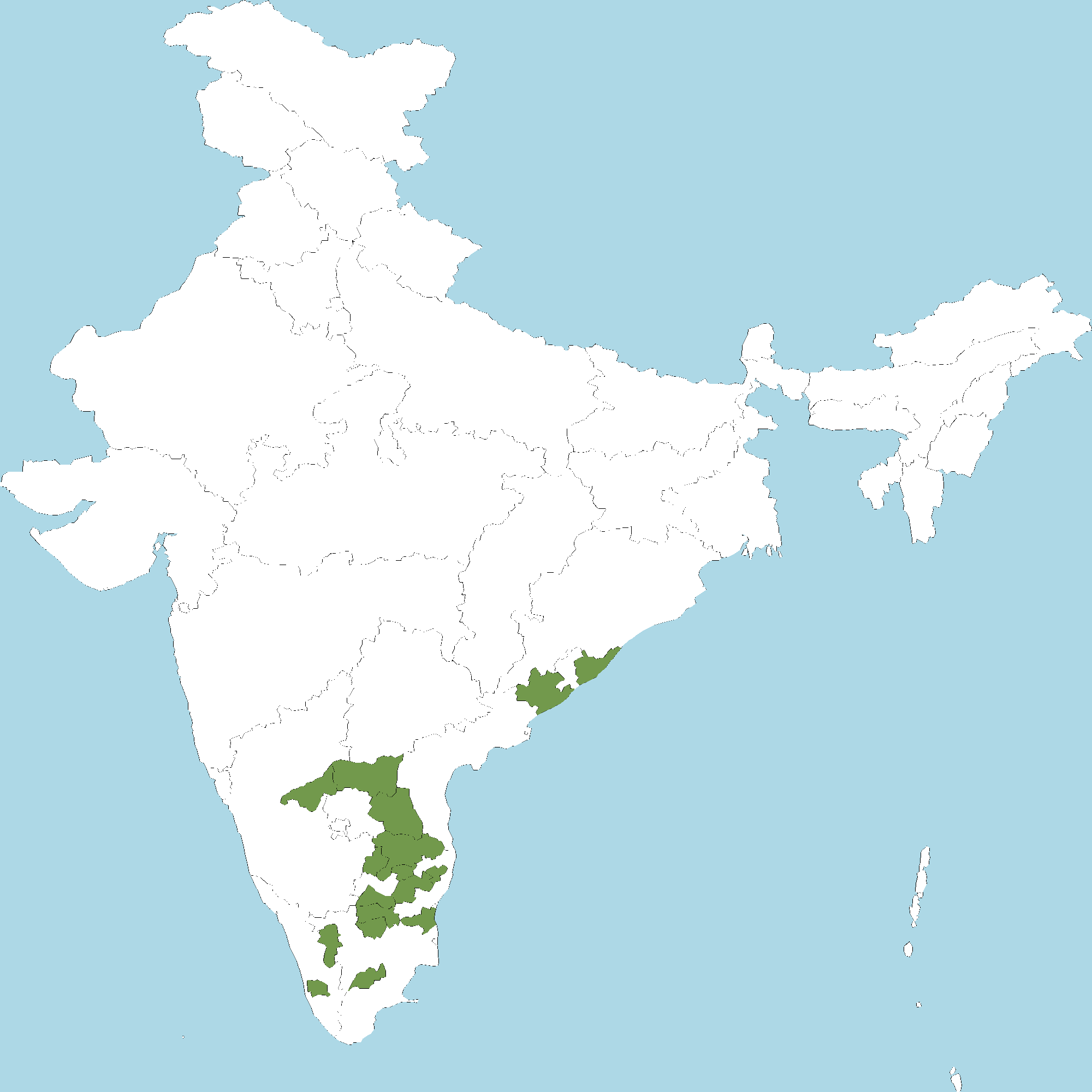 - Tamil Nadu : Namakkal district, Salem district, Vellore district, Tiruchirapalli district, Dharmapuri district, Kancheepuram (Changalpattu-CGP) district, Coimbatore district, Madurai district, Tiruvannamalai district, Villipuram district, Cuddalore district