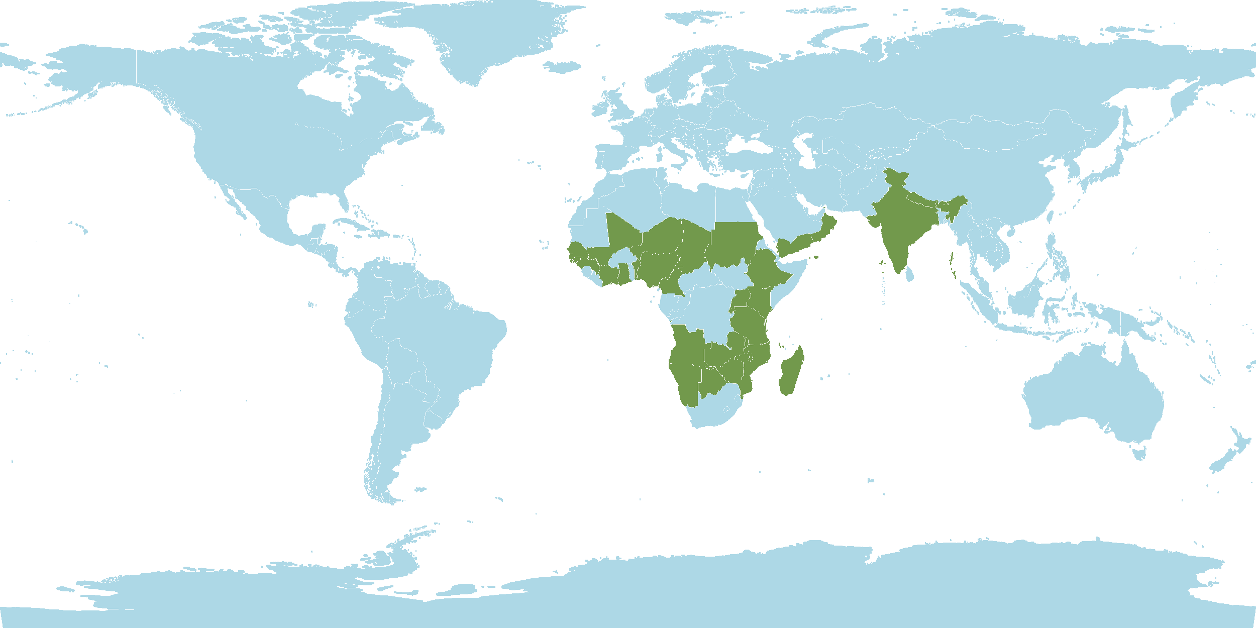 - World Distribution : Angola, Bhutan, Benin, Botswana, Burkina, Cameroon, Central African Repu, Chad, Comoros, Ethiopia, Gambia, Ghana, Guinea, Guinea-Bissau, India, Ivory Coast, Kenya, Madagascar, Malawi, Mali, Mozambique, Namibia, Nepal, Niger, Nigeria, Oman, Rwanda, Senegal, Sudan, Tanzania, Uganda, Yemen, Zambia, Zimbabwe