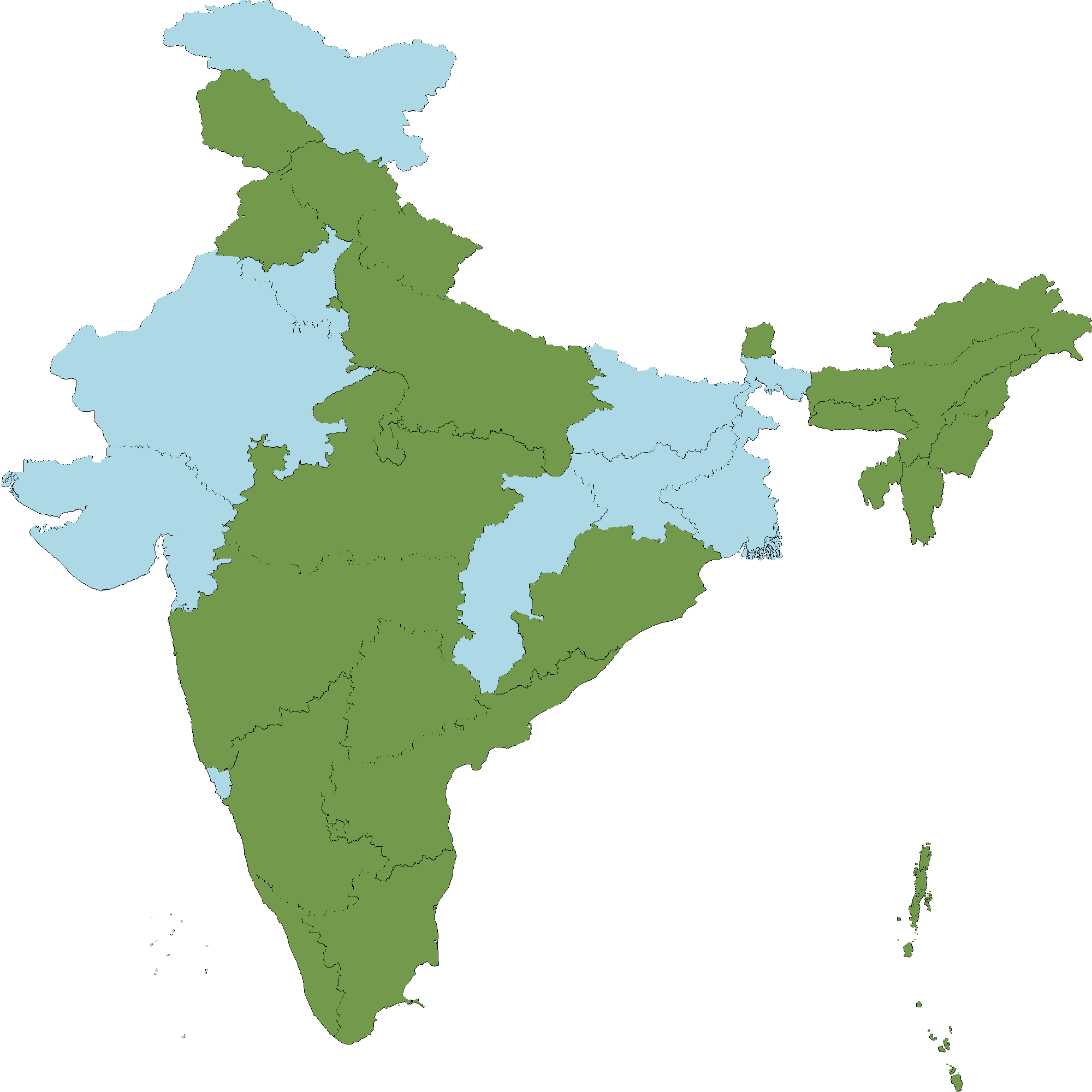- Karnataka : Bagalkot district, Bengaluru district, Belagavi district, Ballari district, Bidar district, Chamarajanagar district, Chikkamagaluru district, Chikkaballapur district, Chitradurga district, Dakshina Kannada district, Davanagare district, Dharwad district, Gadag district, Kalaburagi (Gulbarga) district, Hassan district, Haveri district, Kodagu (Coorg) district, Kolar district, Koppal district, Mandya district, MST, Raichur district, Ramanagara district, Shivamogga district, Tumakuru district, Udupi district, Uttara Kannada district, Yadgir district