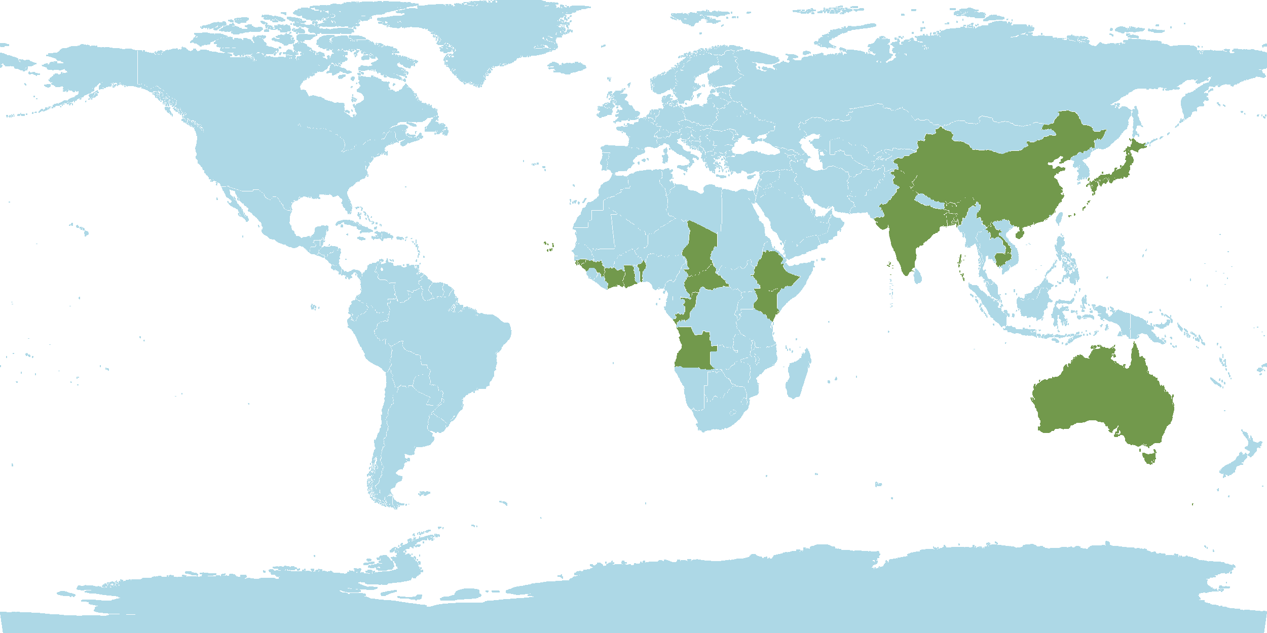 - Native : Angola, Australia, Bangladesh, Benin, Bhutan, Borneo, Burkina, Cambodia, Cape Verde, Central African Republic, Chad, China, Congo, Ethiopia, Gambia, Ghana, Guinea, Guinea-Bissau, India, Inner Mongolia, Ivory Coast, Japan, Jawa, Kazan-retto, Kenya, Laos, L