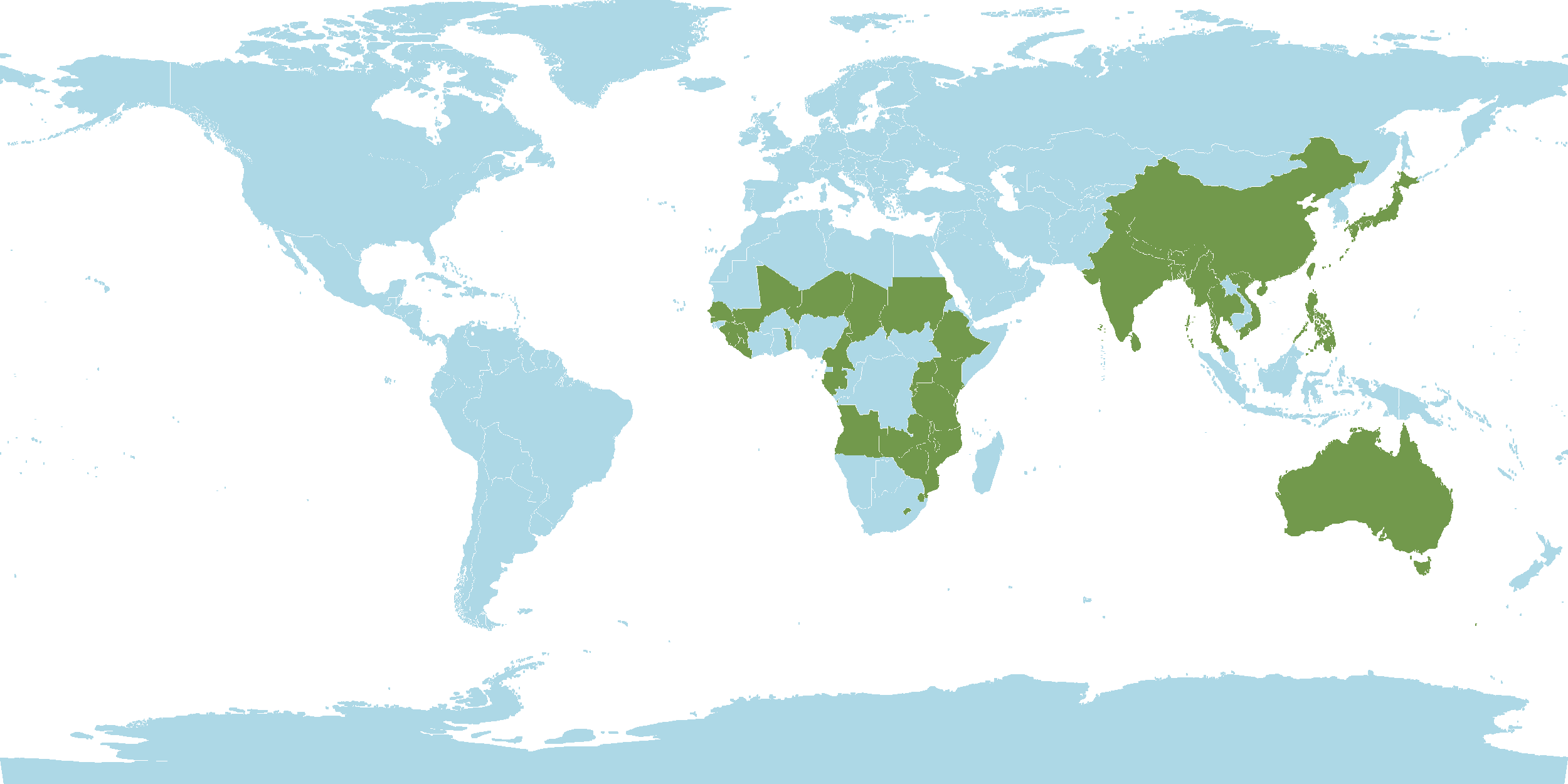 - World Distribution : Angola, Australia, Bangladesh, Bhutan, Burkina, Burundi, Cameroon, Cape Provinces, Central African Repu, Chad, China, Ethiopia, Free State, Gabon, Guinea, Gulf of Guinea Islands, India, Japan, Jawa, Kazan-retto, Kenya, Korea, KwaZulu-Natal, Lesotho, Lesser Sunda Islands, Liberia, Malawi, Malaya, Mali, Manchuria, Mozambique, Myanmar, Nansei-shoto, Nepal, New Guinea, Niger, Norfolk Islands, Northern Provinces, Philippines, Primorye, Rwanda, Senegal, Sierra Leone, Sri Lanka, Sudan, Sulawesi, Sumatera, Swaziland, Taiwan, Tanzania, Thailand, Tibet, Togo, Uganda, Vietnam, Zambia, Zaïre, Zimbabwe
