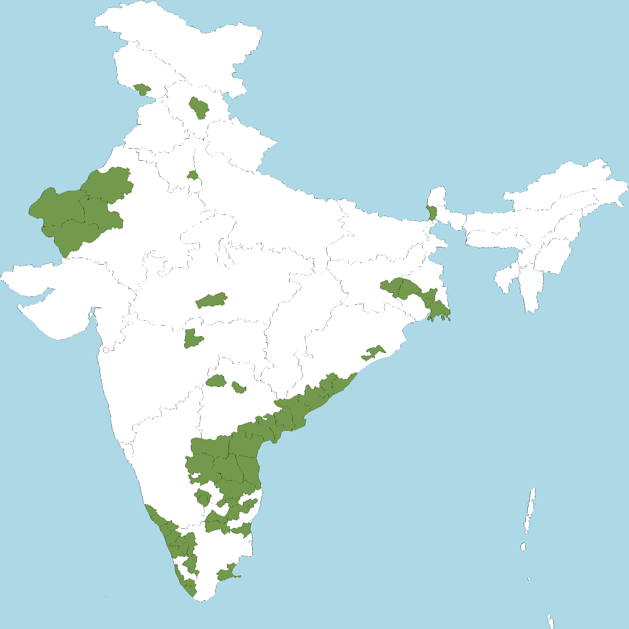 - Kerala : Kasaragod district, Kannur district, Wayanad district, Kozhikode district, Malappuram district, Palakkad district, Thrissur district, Idukki district, Alappuzha district, Kollam district, Thiruvananthapuram district