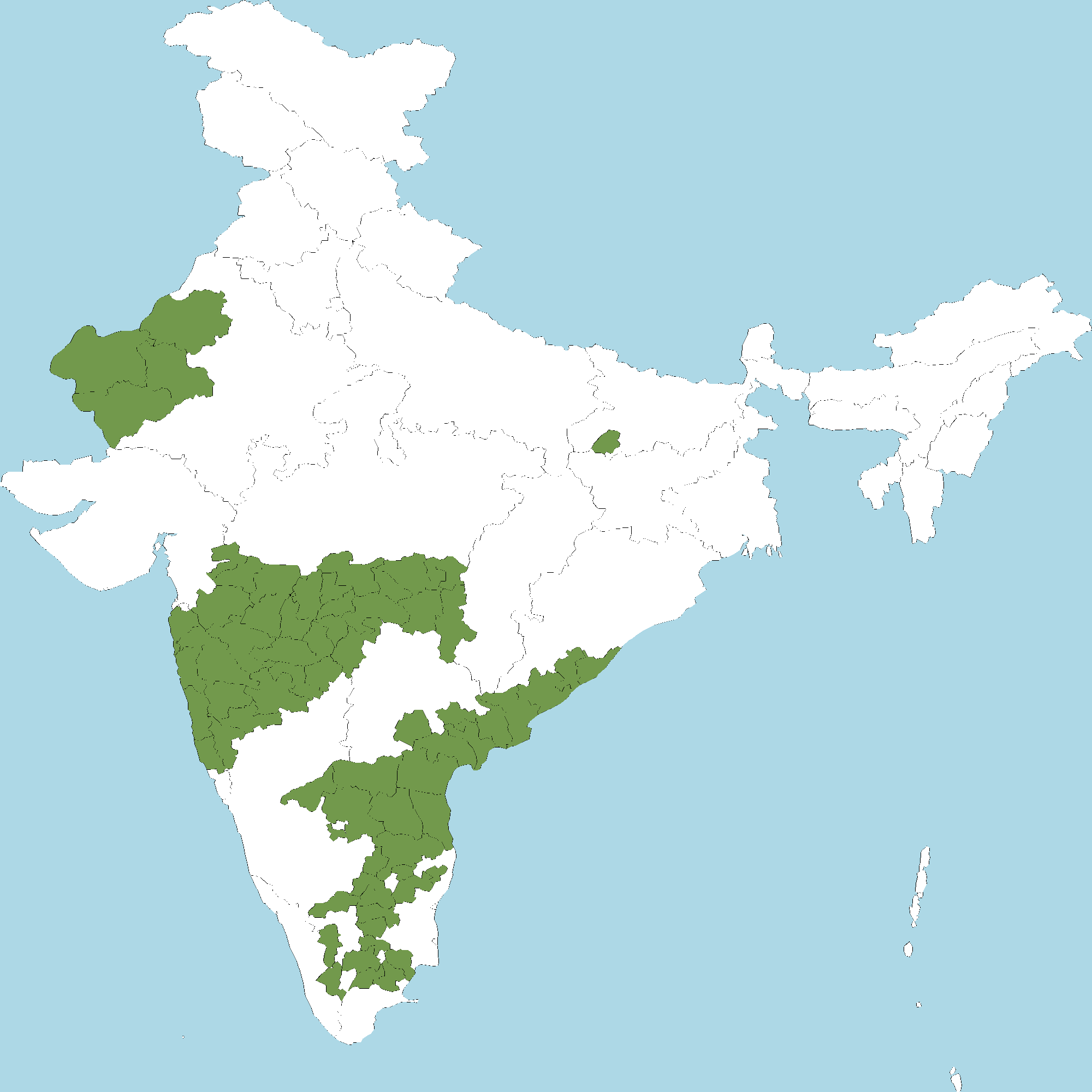 - Andhra Pradesh : Anantapur district, Chittoor district, Y.S.R. Kadapa district, East Godavari district, Guntur district, Krishna district, Kurnool district, S.P.S. Nellore district, Prakasam district, Srikakulam district, Visakhapatnam district, Vizianagaram district, West Godavari district