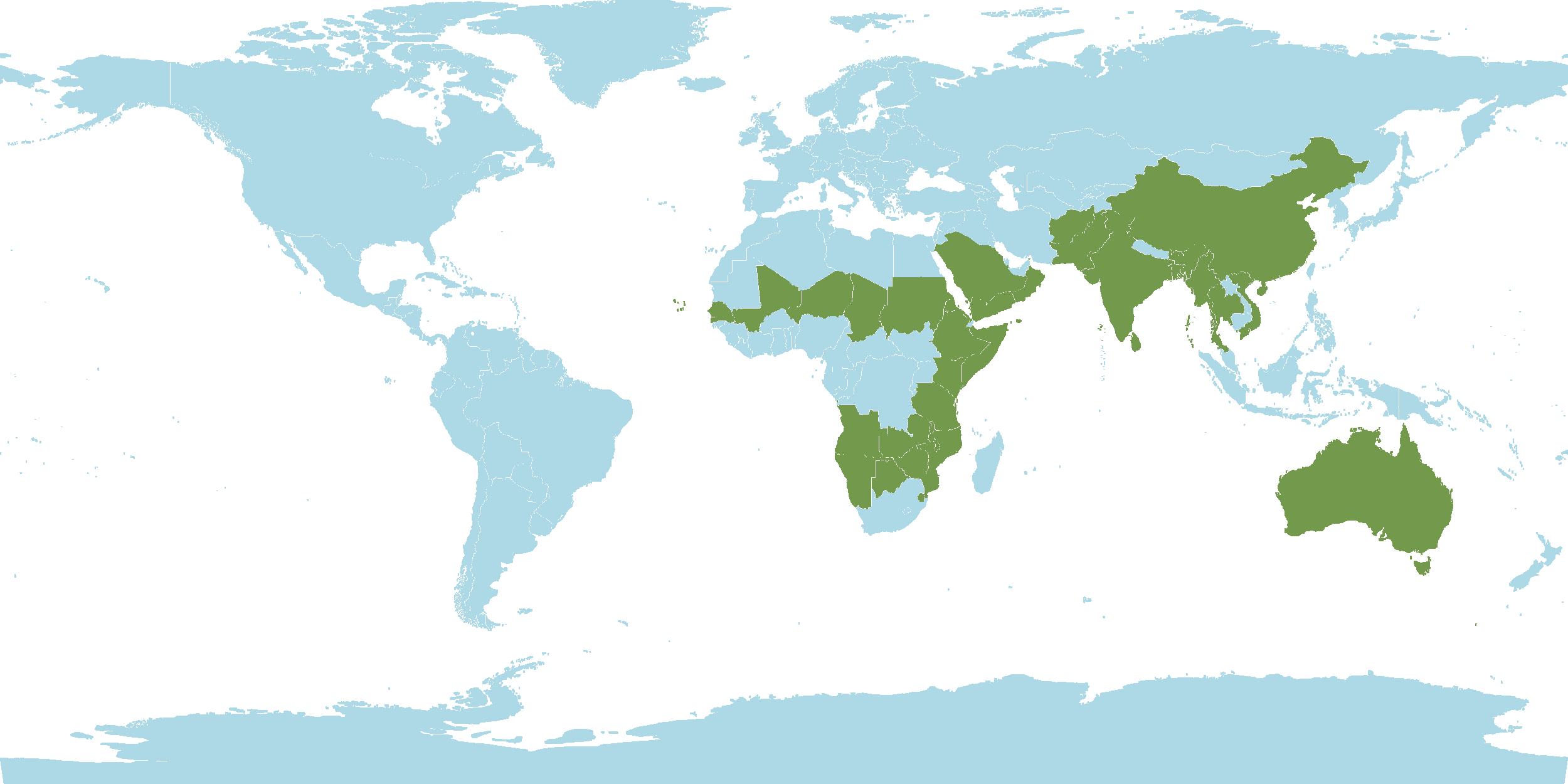 - World Distribution : Afghanistan, Angola, Australia, Bangladesh, Bhutan, Botswana, Cape Verde, Chad, China, Eritrea, Ethiopia, Hainan, India, Kenya, Lesser Sunda Islands, Malawi, Malaya, Mali, Mozambique, Myanmar, Namibia, Niger, Northern Provinces, Oman, Pakistan, Saudi Arabia, Senegal, Socotra, Somalia, Sri Lanka, Sudan, Swaziland, Tanzania, Thailand, Vietnam, Yemen, Zambia, Zaïre, Zimbabwe