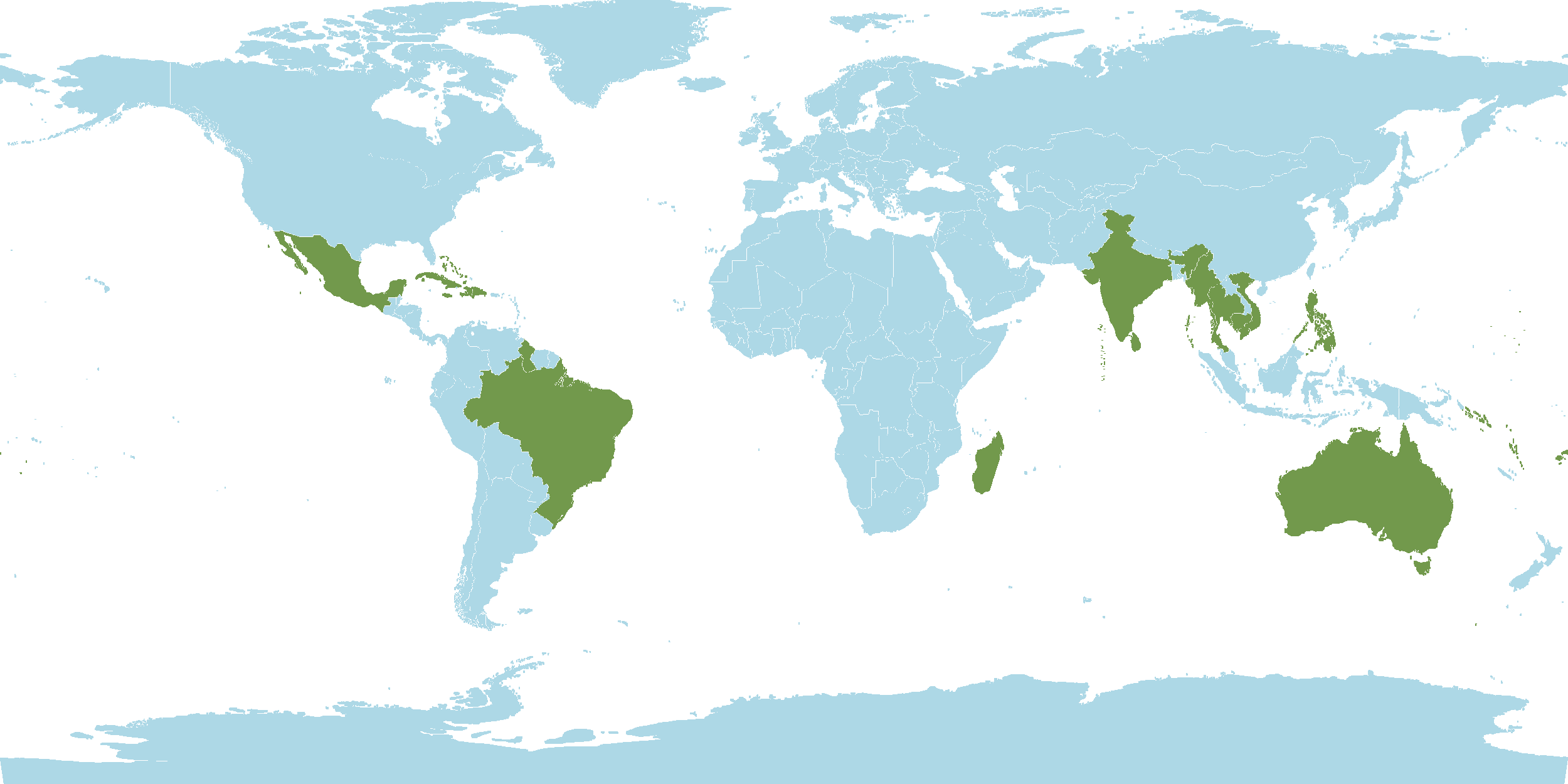 - Native : Australia, Bahamas, Borneo, Brazil, Cambodia, Caroline Islands, Cook Islands, Cuba, Dominican Republic, Easter Islands, Fiji, Florida, Guyana, Haiti, Hawaii, India, Jamaica, Jawa, Kazan-retto, Lesser Sunda Islands, Madagascar, Malaya, Maldives, Maluku, Ma