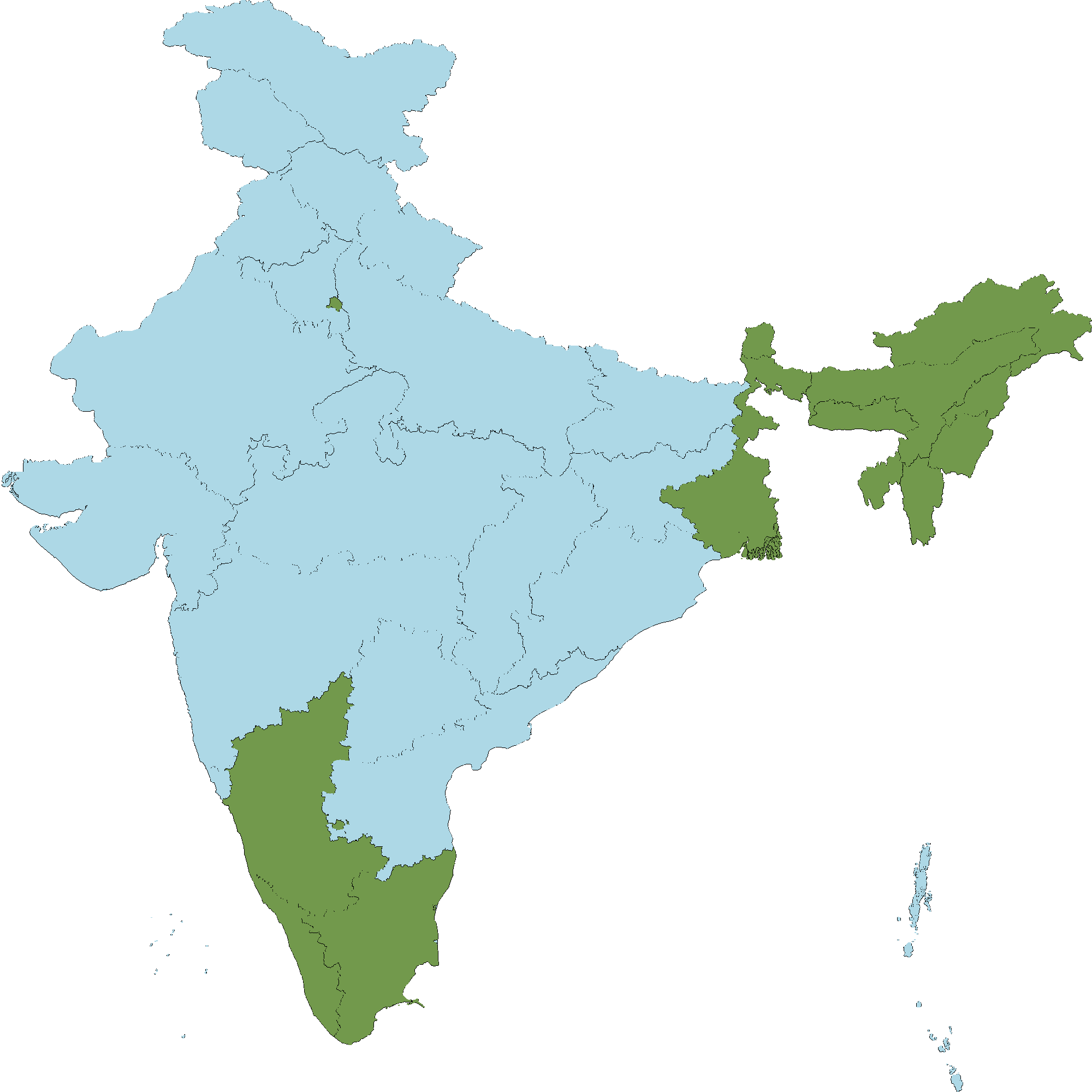 - Karnataka : Bengaluru district, Chikkamagaluru district, Dakshina Kannada district, Kodagu (Coorg) district, Shivamogga district