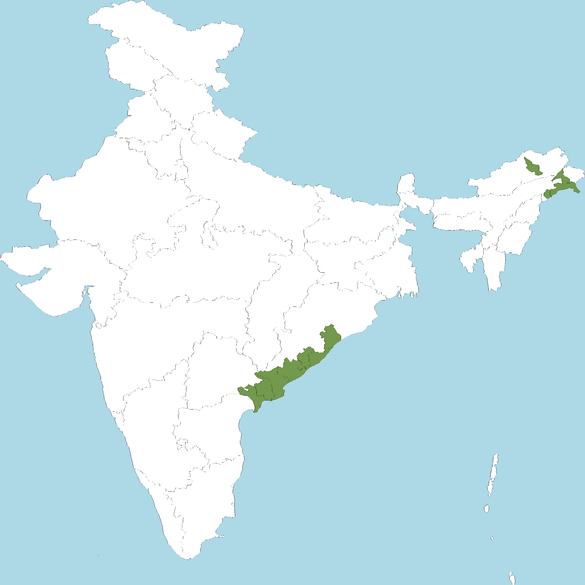 - Andhra Pradesh : Srikakulam district, Visakhapatnam district, Vizianagaram district, East Godavari district, West Godavari district, , Krishna district