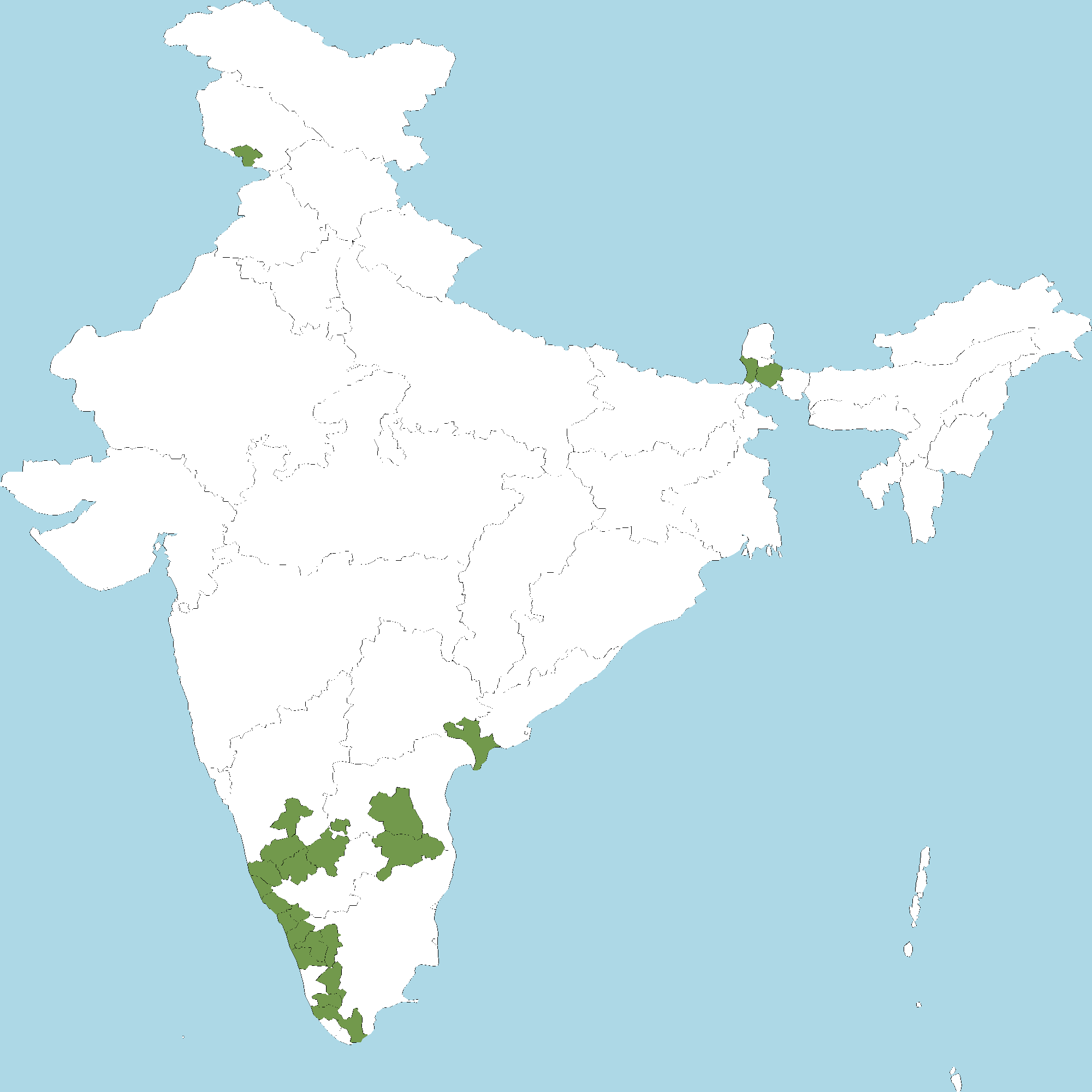 - Kerala : Kasaragod district, Kannur district, Wayanad district, Kozhikode district, Malappuram district, Palakkad district, Thrissur district, Idukki district, Pathanamthitta district, Kollam district