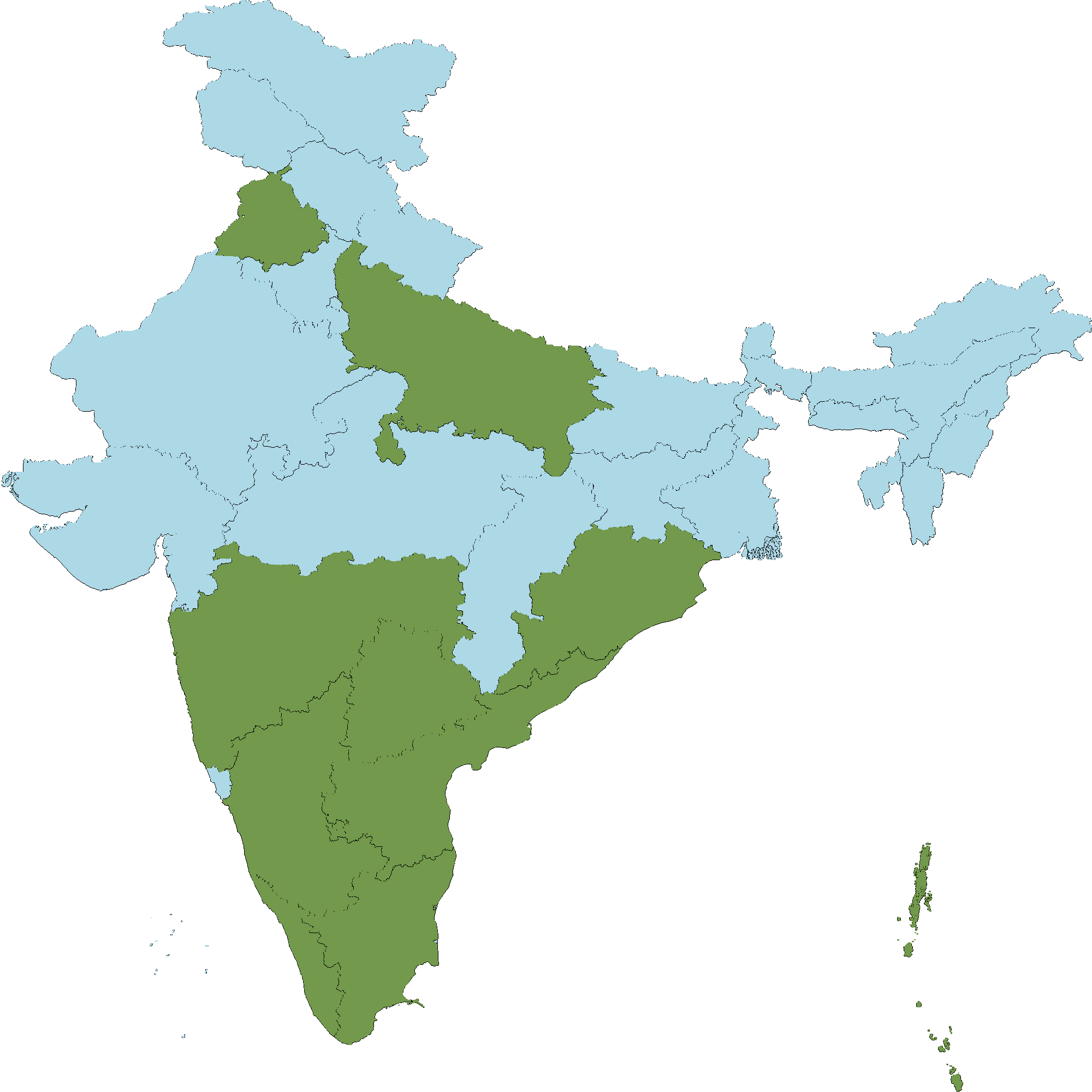 - Andhra Pradesh : Anantapur district, Chittoor district, Kadapa district, East Godavari district, Guntur district, Krishna district, Kurnool district, Nellore district, Prakasam district, Srikakulam district, Vishakapatnam district, Vizianagaram district, West Godavari district