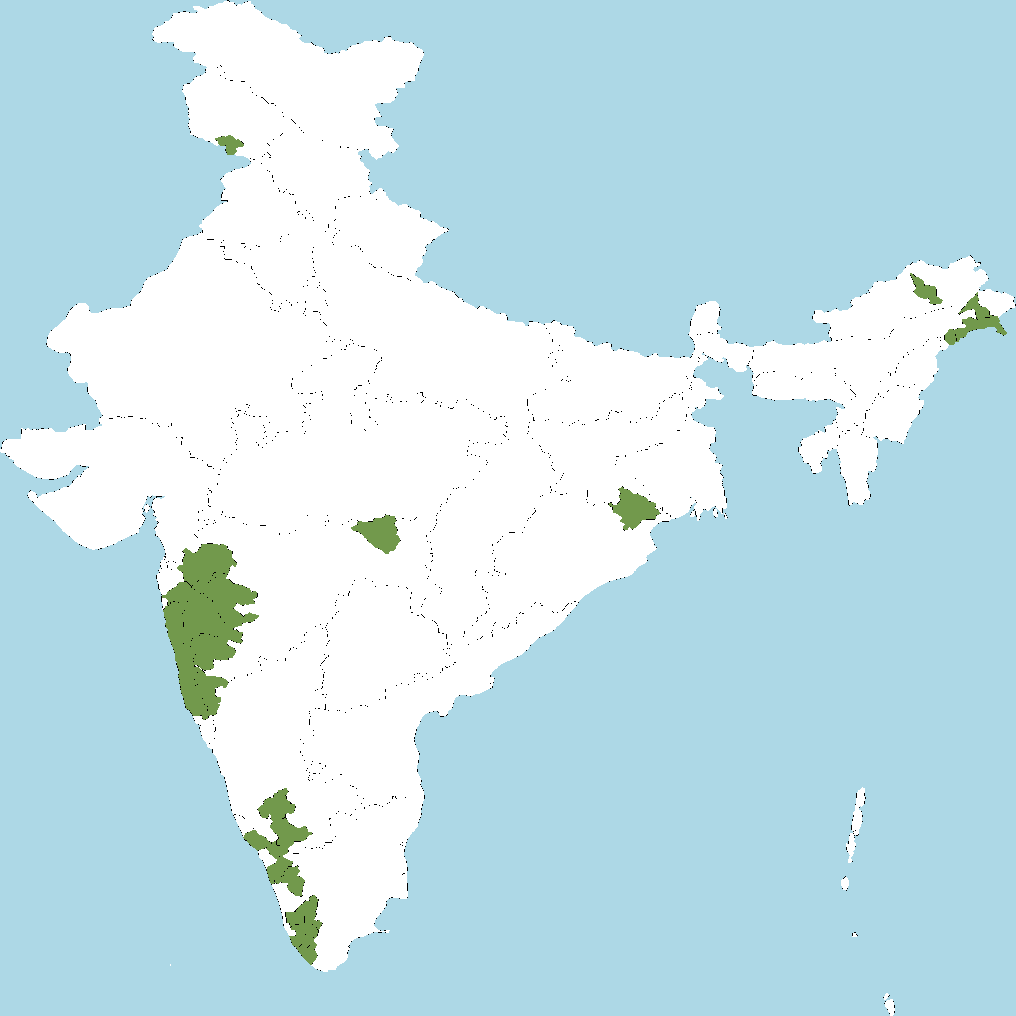 - Kerala : Kannur district, Wayanad district, Malappuram district, Palakkad district, Idukki district, Kottayam district, Pathanamthitta district, Kollam district, Thiruvananthapuram district