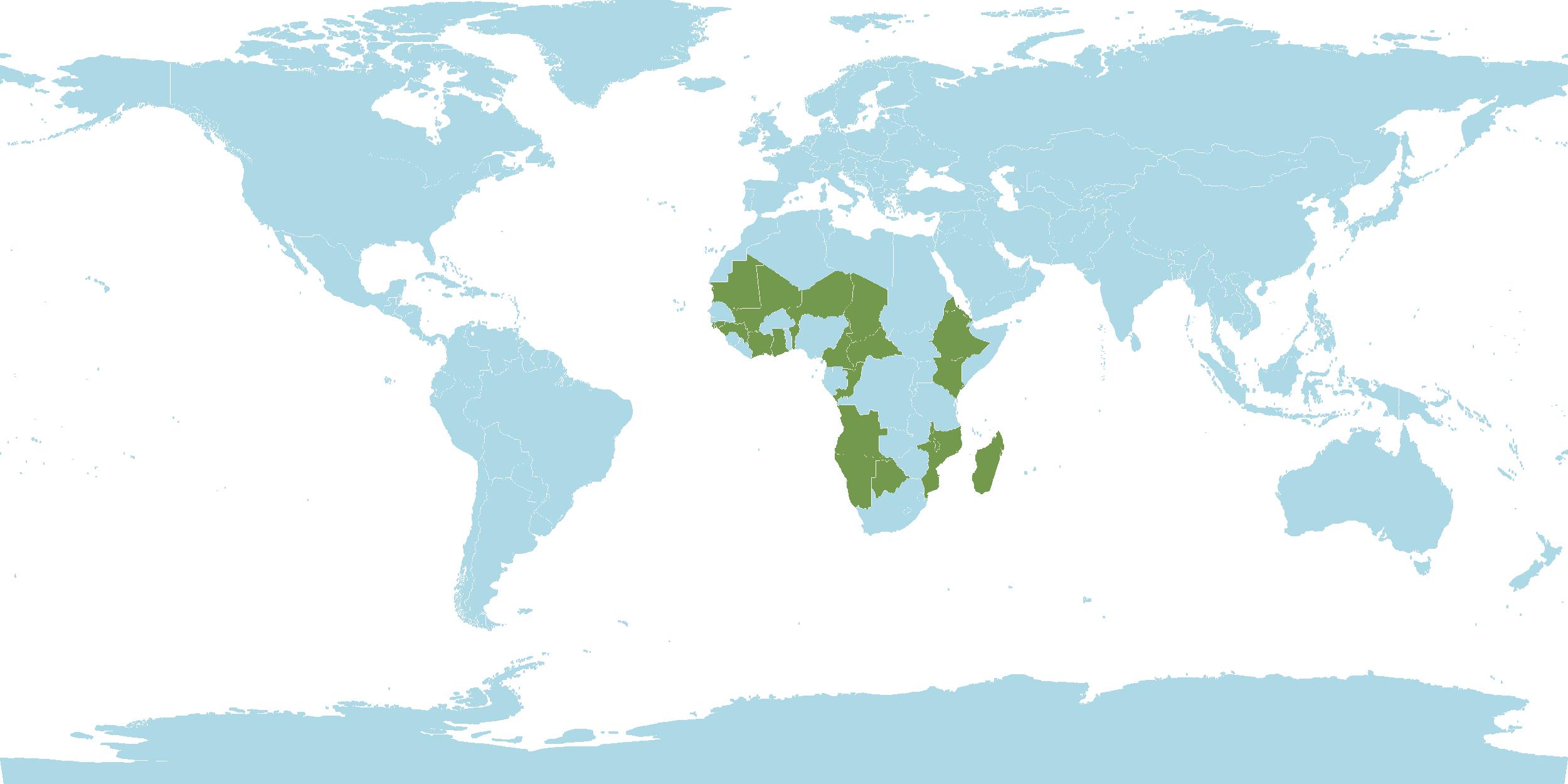 - Native : Angola, Benin, Botswana, Burkina, Cameroon, Caprivi Strip, Central African Republic, Chad, Congo, Eritrea, Ethiopia, Gambia, Ghana, Guinea, Guinea-Bissau, Gulf of Guinea Is., Ivory Coast, Kenya, Malawi, Mali, Mauritania, Mozambique, Namibia, Niger, Nigeri