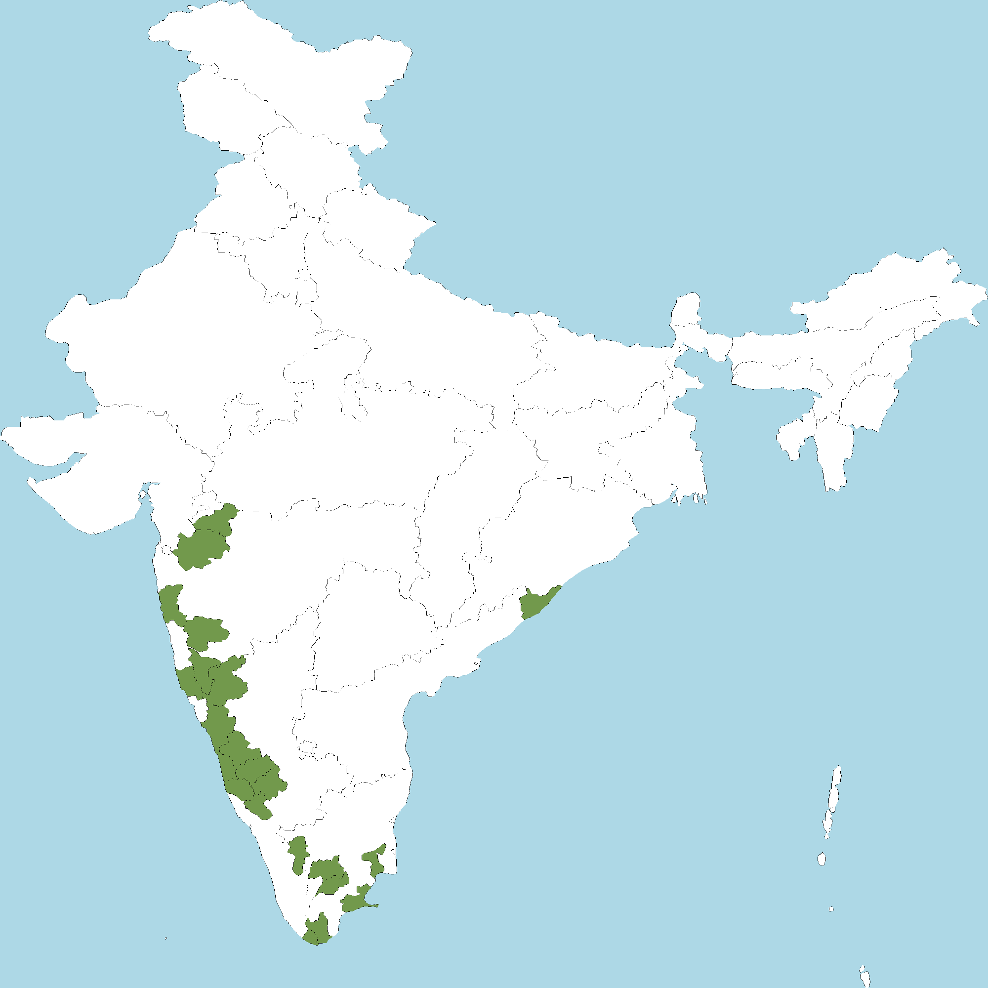 - Karnataka : Belagavi district, Chikkamagaluru district, Dakshina Kannada district, Hassan district, Kodagu (Coorg) district, Shivamogga district, Udupi district, Uttara Kannada district