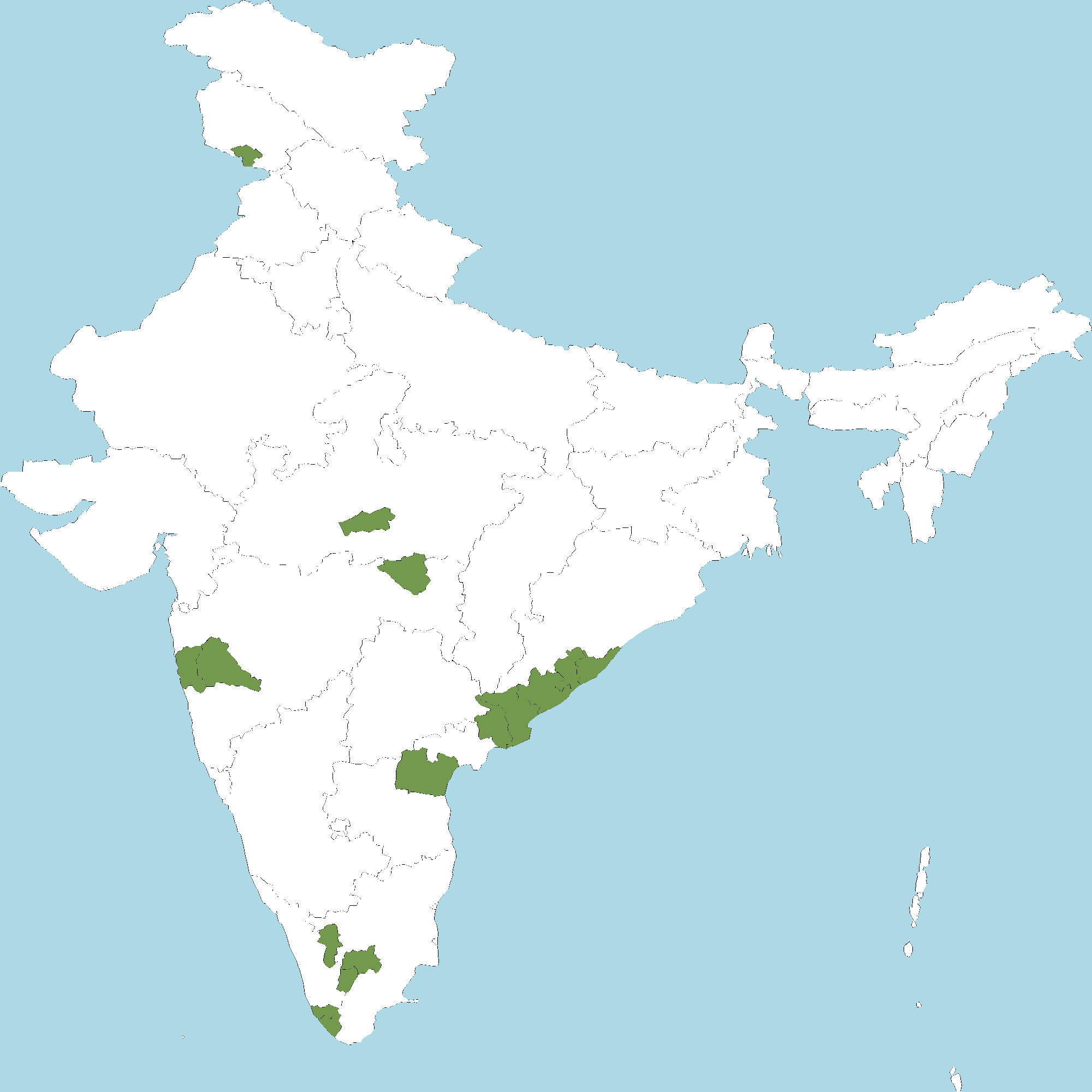 - Andhra Pradesh : Srikakulam district, Galikonda Hills (Visakhapatnam district), Vizianagaram district, East Godavari district, West Godavari district, Prakasam district