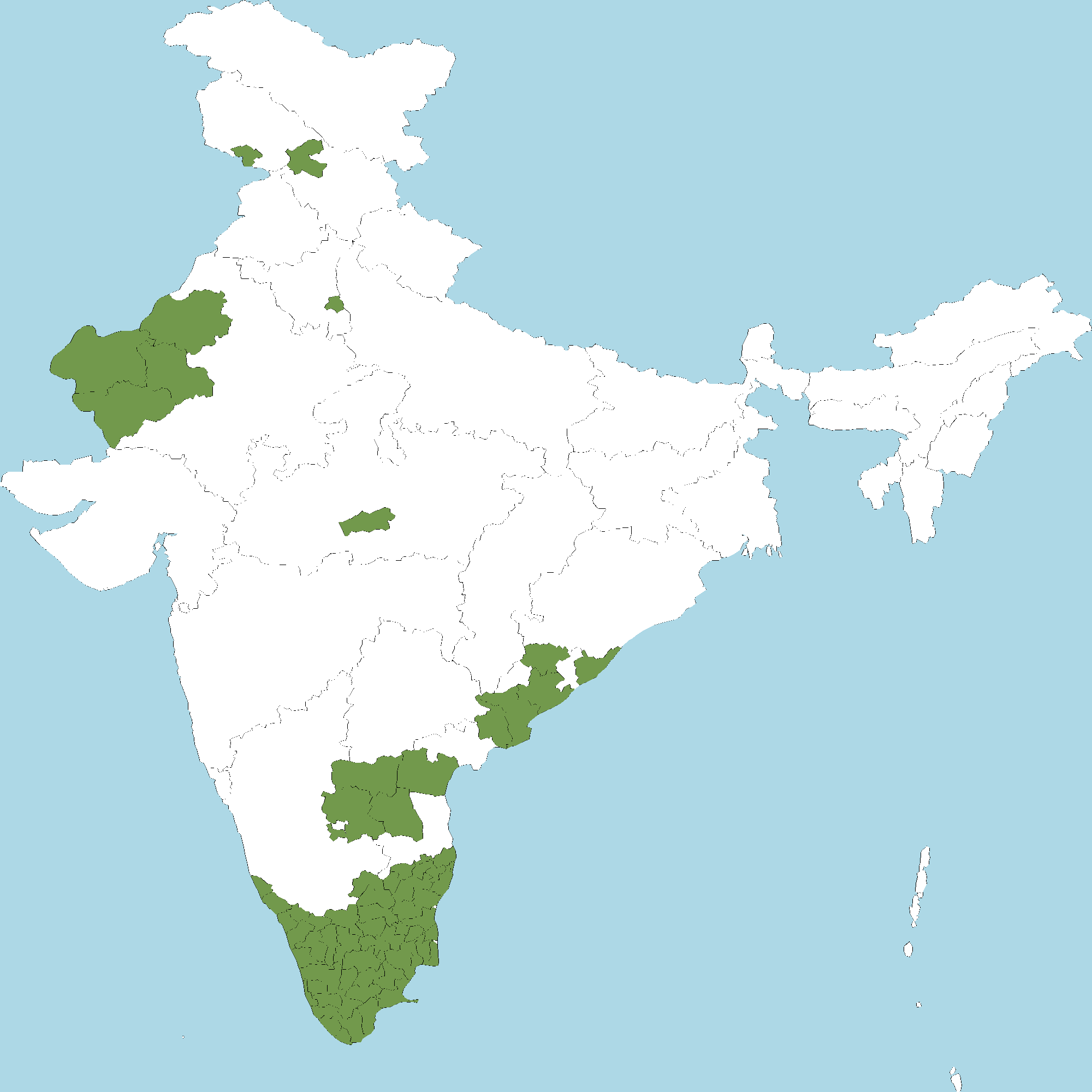 - Andhra Pradesh : East Godavari district, Visakhapatnam district, Anantapur district, Y.S.R. Kadapa district, Prakasam district, West Godavari district, Kurnool district, Srikakulam district