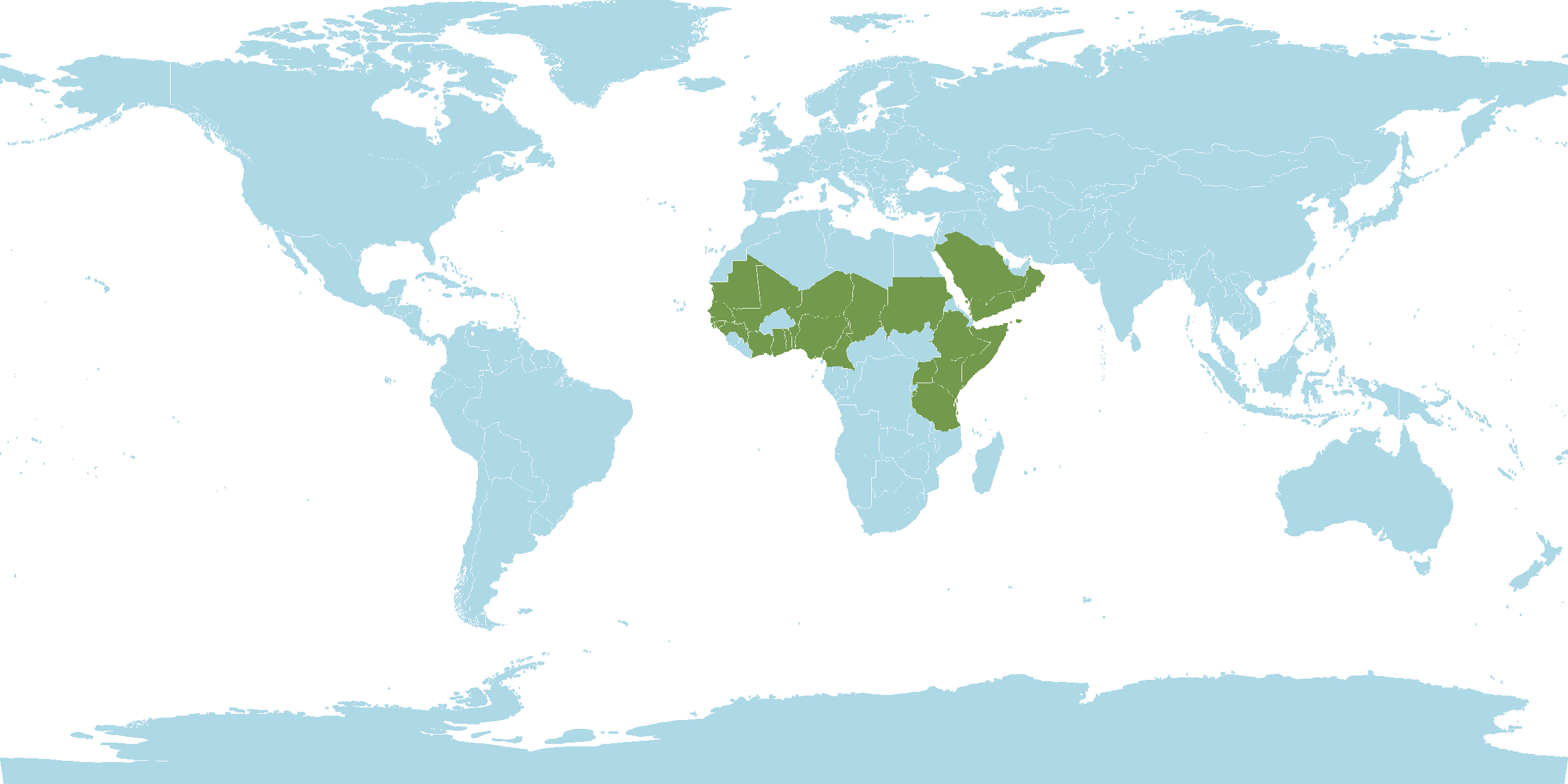 - Native : Benin, Burkina, Burundi, Cameroon, Chad, Ethiopia, Ghana, Guinea, Guinea-Bissau, Ivory Coast, Kenya, Mali, Mauritania, Niger, Nigeria, Oman, Saudi Arabia, Senegal, Socotra, Somalia, Sudan, Tanzania, Togo, Uganda, Yemen