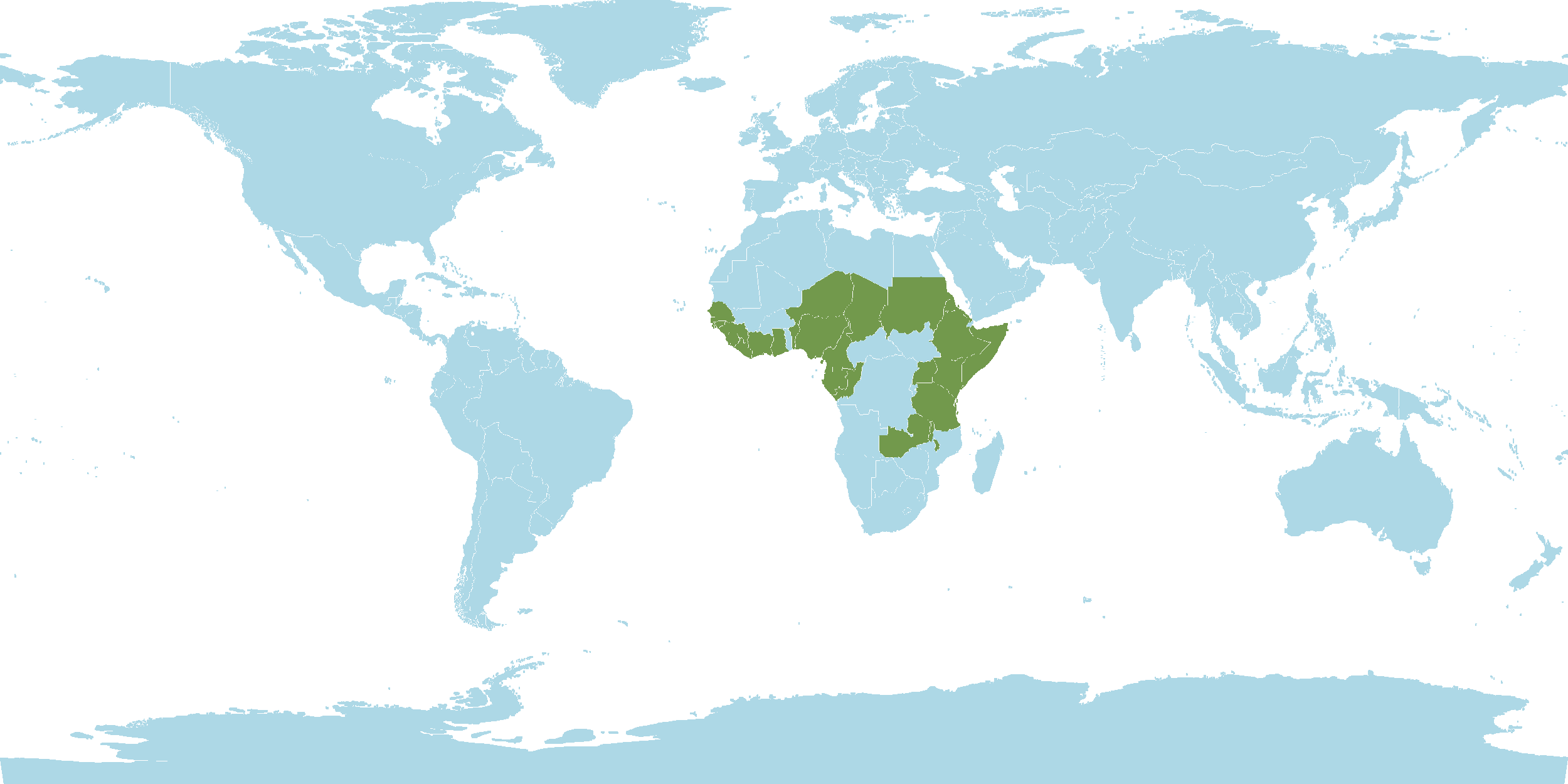 - Native : Benin, Cameroon, Central African Repu, Chad, Congo, Equatorial Guinea, Eritrea, Ethiopia, Gabon, Ghana, Guinea, Guinea-Bissau, Ivory Coast, Kenya, Liberia, Malawi, Niger, Nigeria, Senegal, Sierra Leone, Somalia, Sudan, Tanzania, Uganda, Zambia, Zaïre