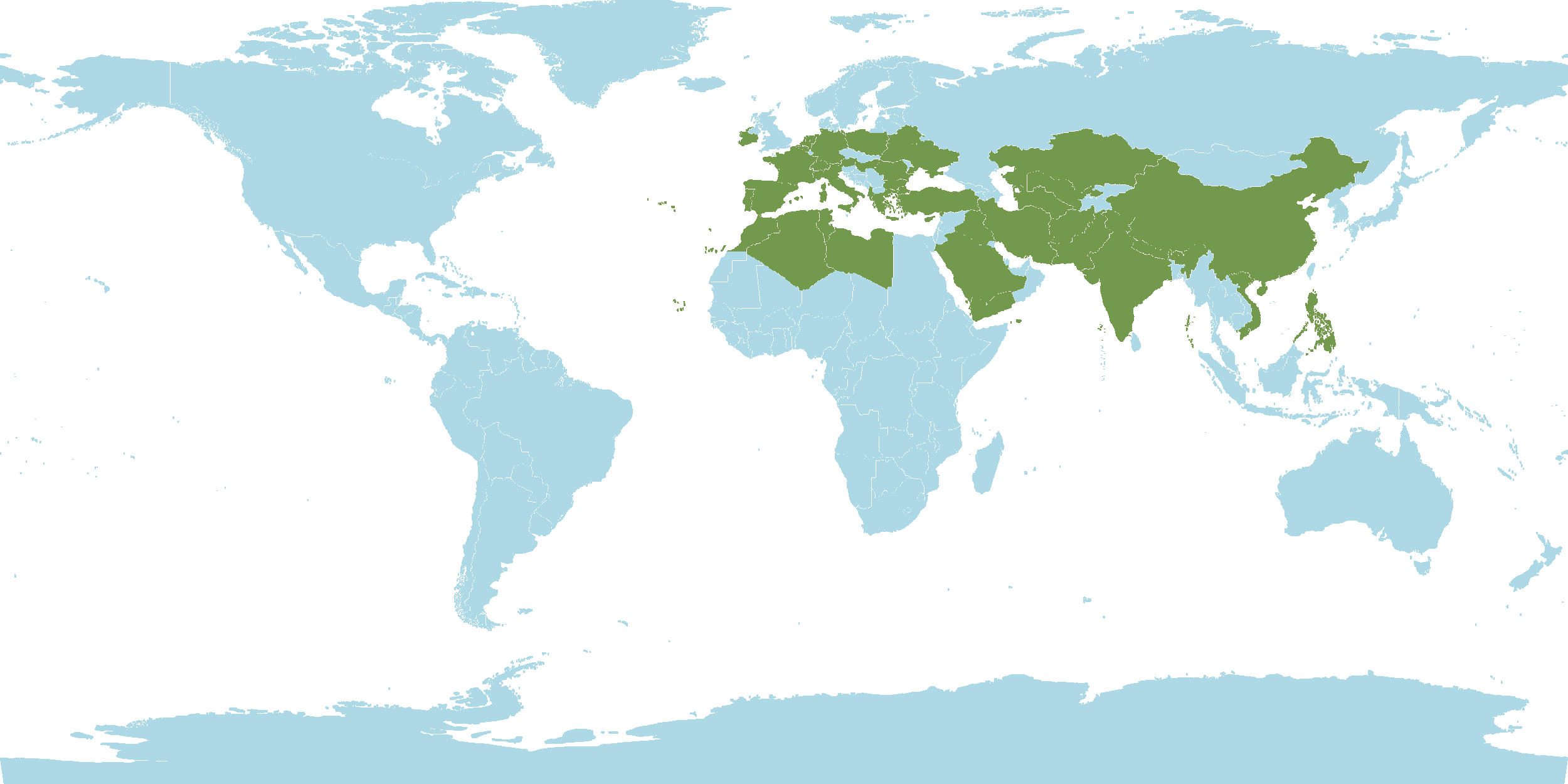 - World Distribution : Afghanistan, Albania, Algeria, Austria, Azores, Baleares, Baltic States, Belarus, Belgium, Bhutan, Bulgaria, Canary Islands, Cape Verde, Central European Russia, China, Corse, Cyprus, Czechoslovakia, East Aegean Islands, East European Russia, France, Germany, Great Britain, Greece, Hungary, India, Iran, Iraq, Ireland, Italy, Jawa, Kazakhstan, Kriti, Lebanon-Syria, Libya, Madeira, Malaya, Manchuria, Morocco, Nepal, Netherlands, New Guinea, North Caucasus, Northwest European Russia, Pakistan, Palestine, Panamá, Philippines, Poland, Portugal, Romania, Sardegna, Saudi Arabia, Sicilia, Sinai, South European Russia, Spain, Switzerland, Tadzhikistan, Tibet, Transcaucasus, Tunisia, Turkey, Turkey-in-Europe, Turkmenistan, Ukraine, Uzbekistan, Vietnam, Yemen, Yugoslavia