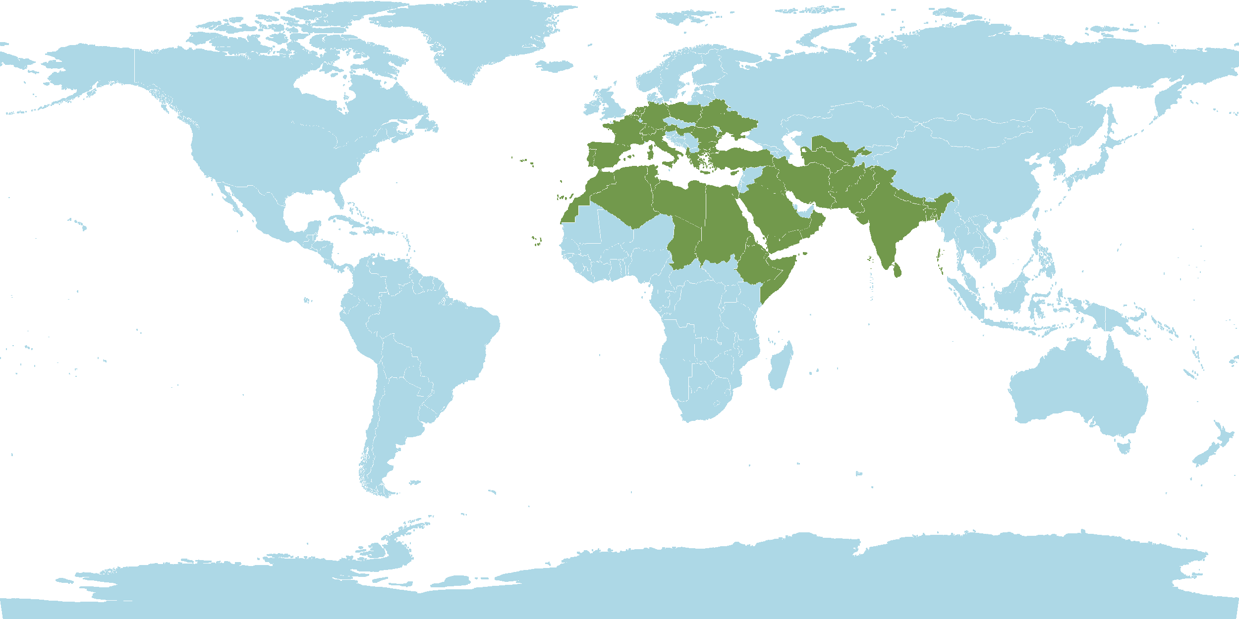 - World Distribution : Afghanistan, Albania, Algeria, Austria, Azores, Baleares, Baltic States, Bangladesh, Belarus, Belgium, Bulgaria, Canary Islands, Cape Verde, Central European Russia, Chad, Corse, Cyprus, Czechoslovakia, Djibouti, East Aegean Islands, Egypt, Eritrea, Ethiopia, France, Germany, Greece, Gulf States, Hungary, India, Iran, Iraq, Italy, Kirgizstan, Kriti, Krym, Kuwait, Lebanon-Syria, Libya, Madeira, Morocco, Nepal, Netherlands, North Caucasus, Oman, Pakistan, Palestine, Panamá, Poland, Portugal, Romania, Sardegna, Saudi Arabia, Sicilia, Sinai, Socotra, Somalia, Spain, Sri Lanka, Sudan, Switzerland, Tadzhikistan, Transcaucasus, Tunisia, Turkey, Turkey-in-Europe, Turkmenistan, Ukraine, Uzbekistan, Western Sahara, Yemen, Yugoslavia