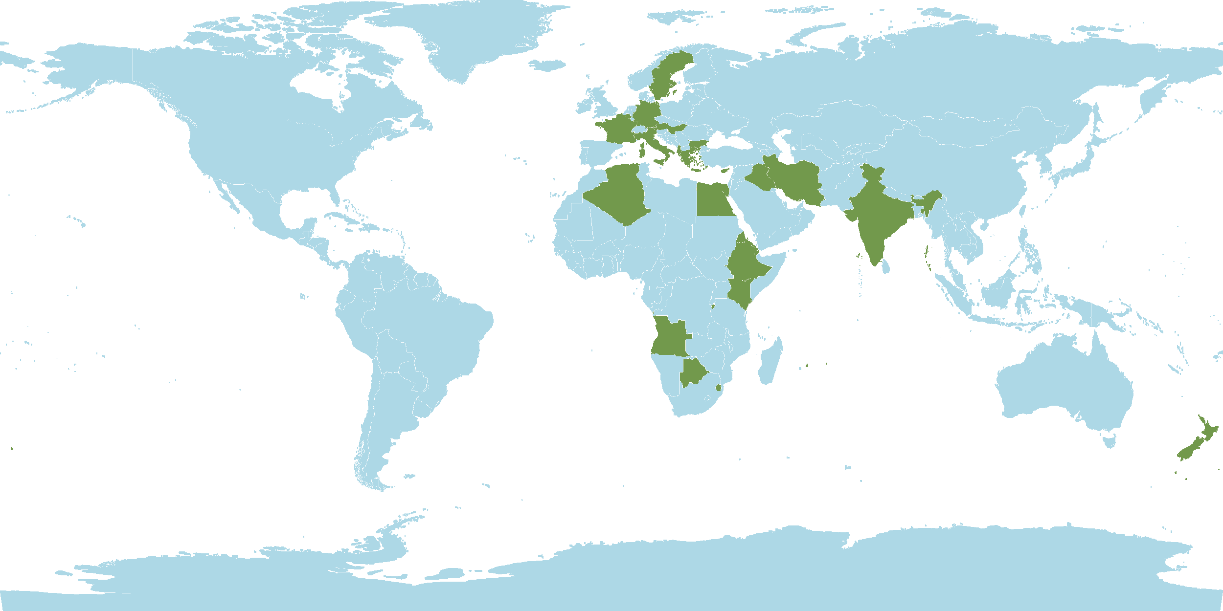 - Native : Albania, Algeria, Altay, Angola, Austria, Azores, Baleares, Bulgaria, Burundi, Corse, Cyprus, Czechoslovakia, Djibouti, East Aegean Is., Egypt, Eritrea, Ethiopia, France, Germany, Greece, Hungary, Iran, Iraq, Italy, Kenya, Kriti, Krym, Lebanon-Syria, Made