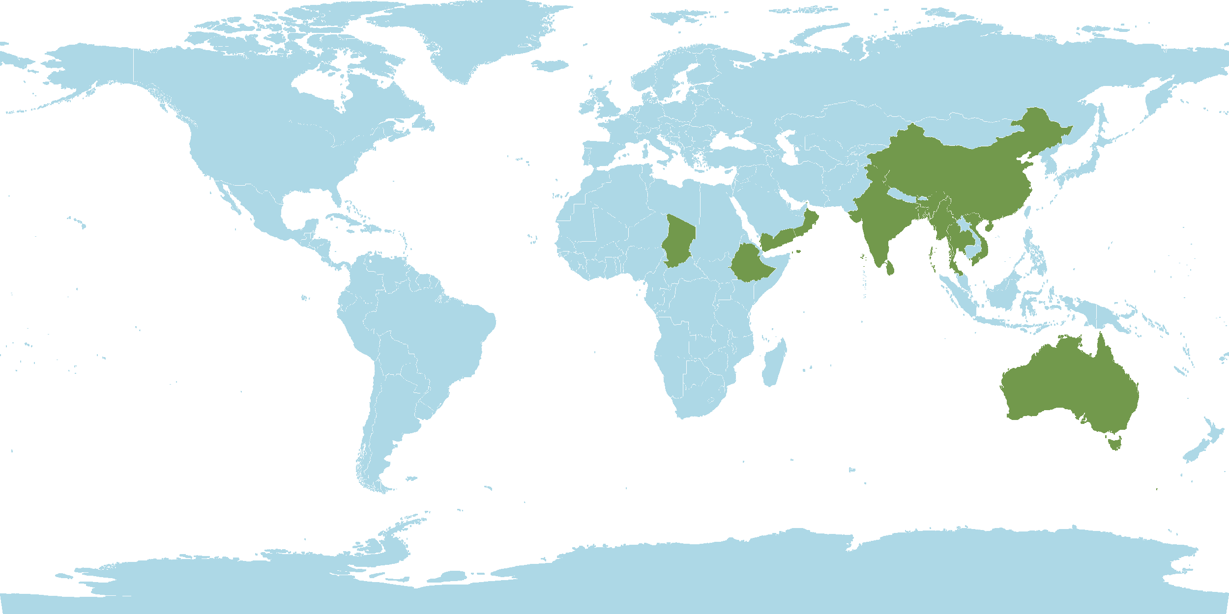 - Native : Australia, Bangladesh, Borneo, Chad, China, Ethiopia, Hainan, India, Jawa, Malaya, Myanmar, Oman, Sri Lanka, Sumatera, Thailand, Vietnam, Yemen