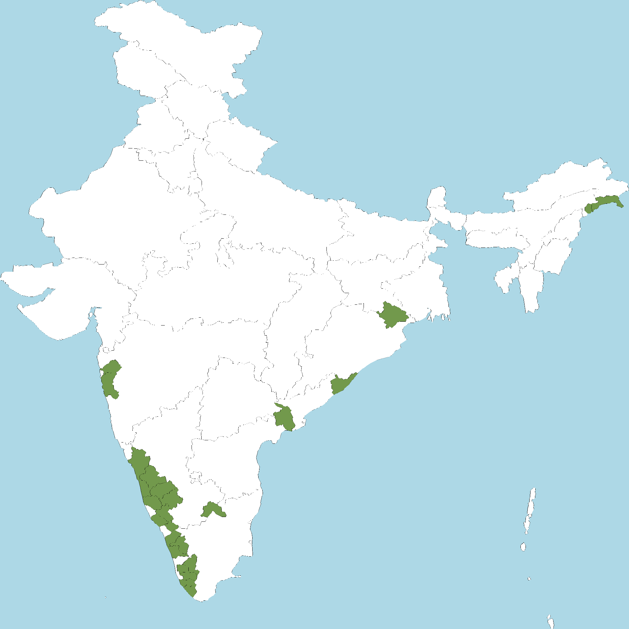 - Kerala : Kannur district, Wayanad district, Malappuram district, Palakkad district, Thrissur district, Idukki district, Kottayam district, Pathanamthitta district, Kollam district, Thiruvananthapuram district