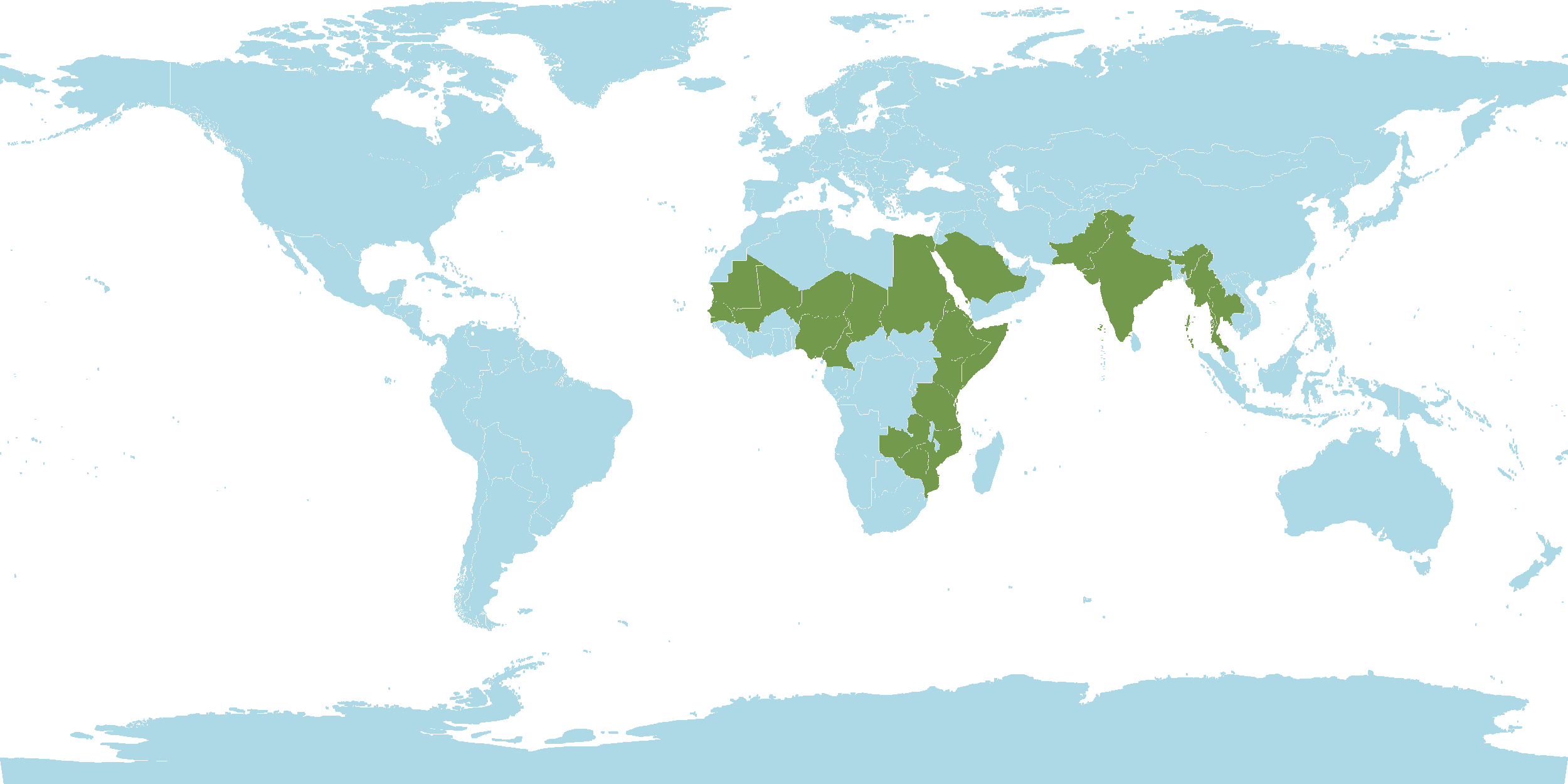 - Native : Burkina, Cameroon, Central African Repu, Chad, Djibouti, Egypt, Eritrea, Ethiopia, Gulf States, India, Jawa, Kenya, Mali, Mauritania, Mozambique, Myanmar, Niger, Nigeria, Northern Provinces, Pakistan, Palestine, Saudi Arabia, Senegal, Sinai, Somalia, Suda