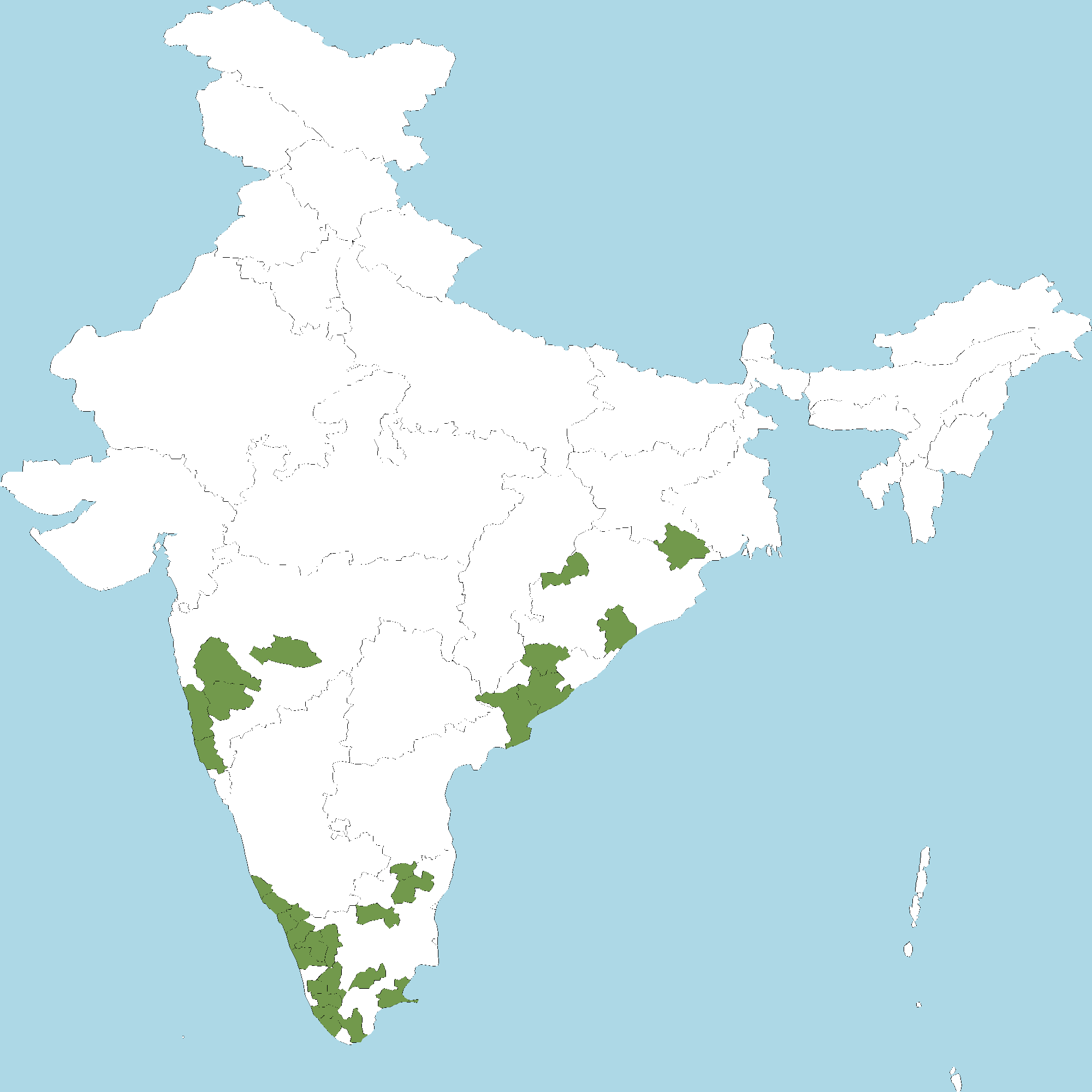 - Kerala : Kasaragod district, Kannur district, Wayanad district, Kozhikode district, Malappuram district, Palakkad district, Thrissur district, Idukki district, Kottayam district, Pathanamthitta district, Kollam district, Thiruvananthapuram district