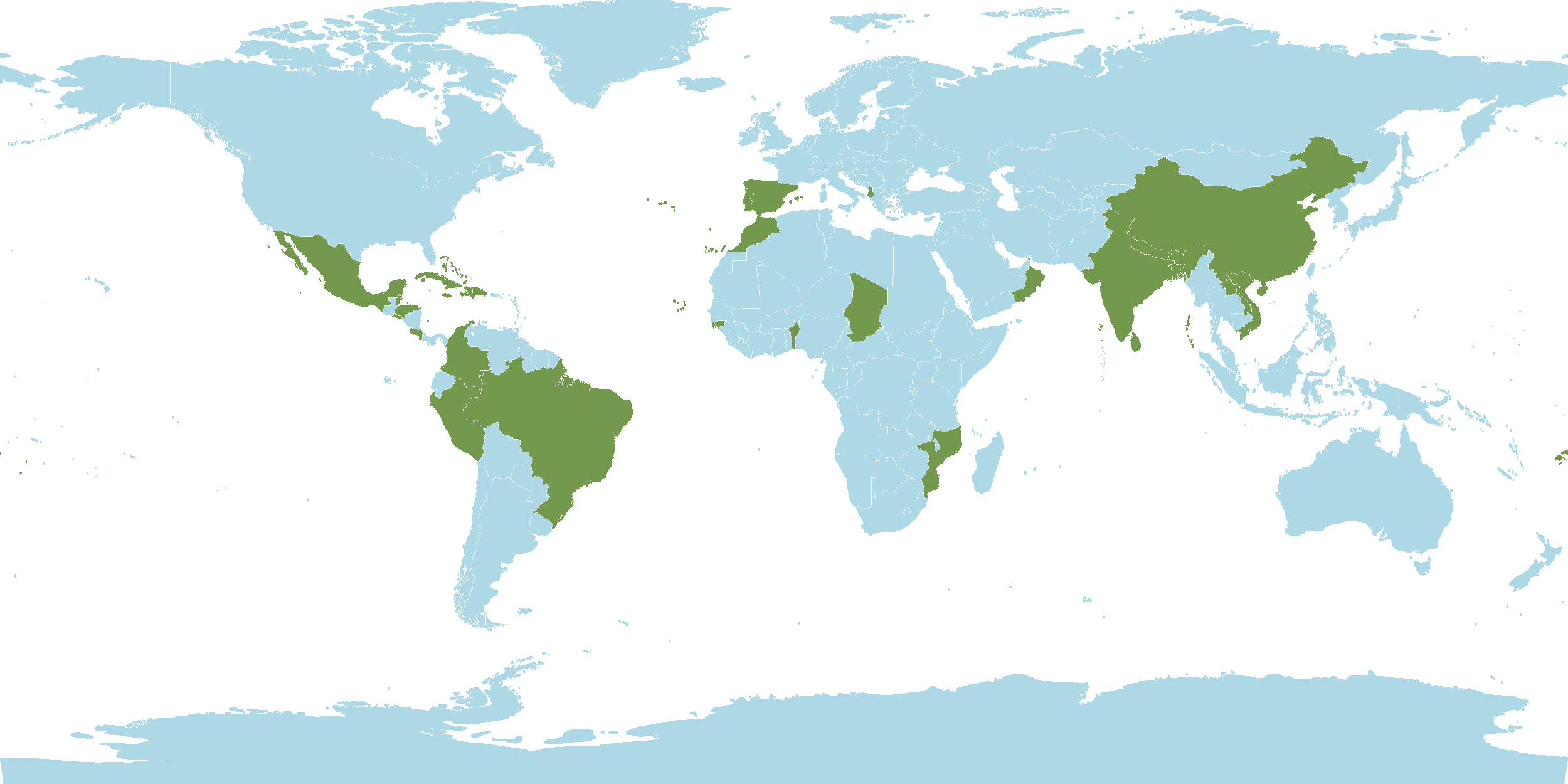 - World Distribution : Albania, Bahamas, Bangladesh, Belize, Benin, Bhutan, Bermuda, Borneo, Brazil, Cape Verde, Chad, China, Colombia, Costa Rica, Cuba, Dominican Republic, El Salvador, Fiji, Florida, Galápagos, Gambia, Guinea-Bissau, Gulf of Guinea Islands, Haiti, Honduras, India, Jamaica, Korea, Laos, Leeward Islands, Mexico, Morocco, Mozambique, Nepal, New Caledonia, Oman, Peru, Portugal, Puerto Rico, Spain, Sri Lanka, Tadzhikistan, Tonga, Trinidad-Tobago, Vietnam