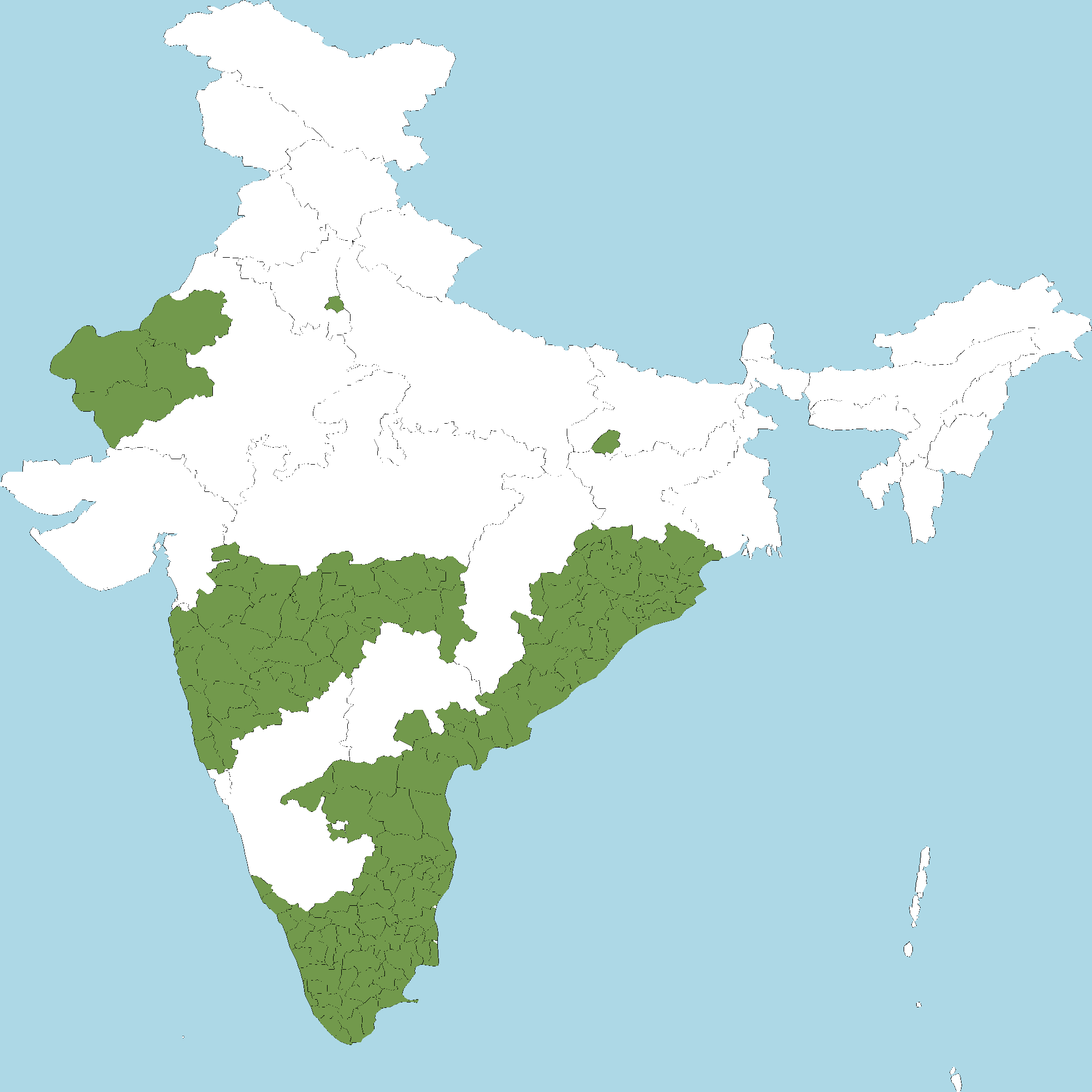 - Andhra Pradesh : Anantapur district, Chittoor district, Y.S.R. Kadapa district, East Godavari district, Guntur district, Krishna district, Kurnool district, S.P.S. Nellore district, Prakasam district, Srikakulam district, Visakhapatnam district, Vizianagaram district, West Godavari district