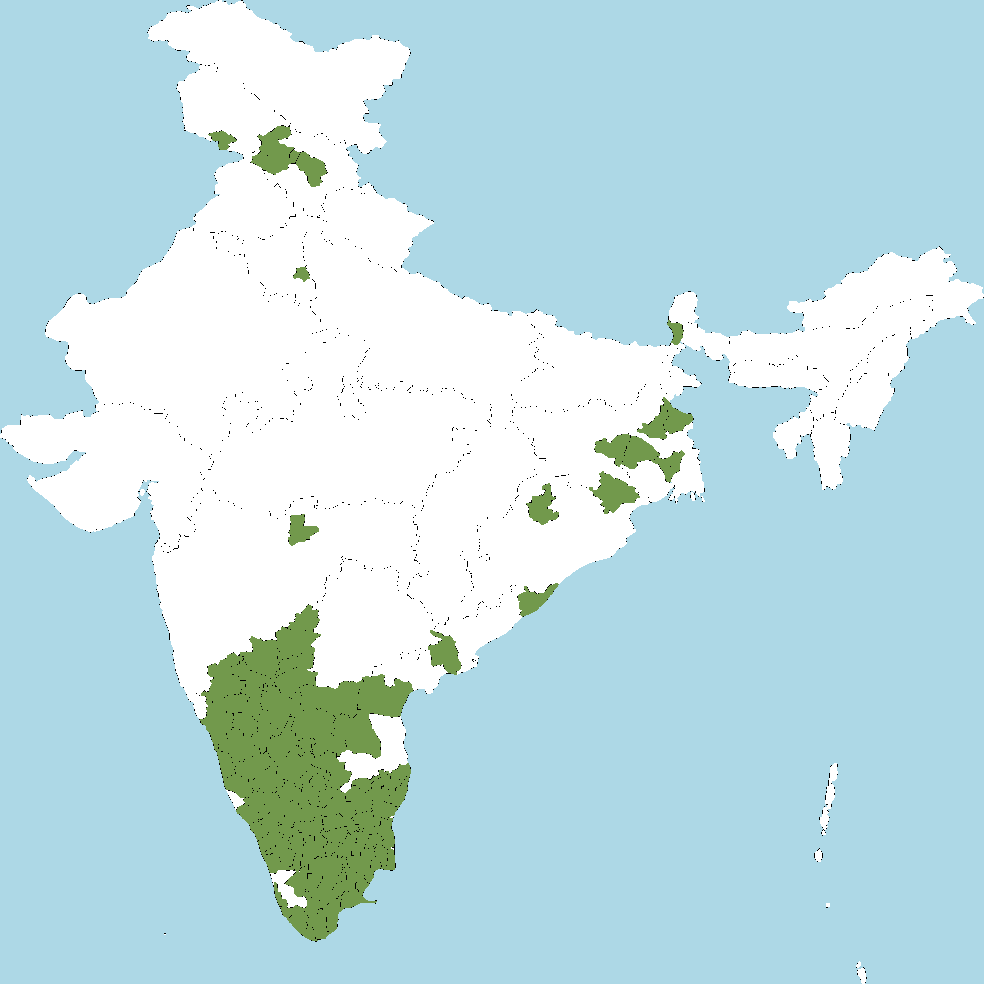 - Kerala : Kannur district, Wayanad district, Kozhikode district, Malappuram district, Palakkad district, Thrissur district, Idukki district, Alappuzha district, Kollam district, Thiruvananthapuram district