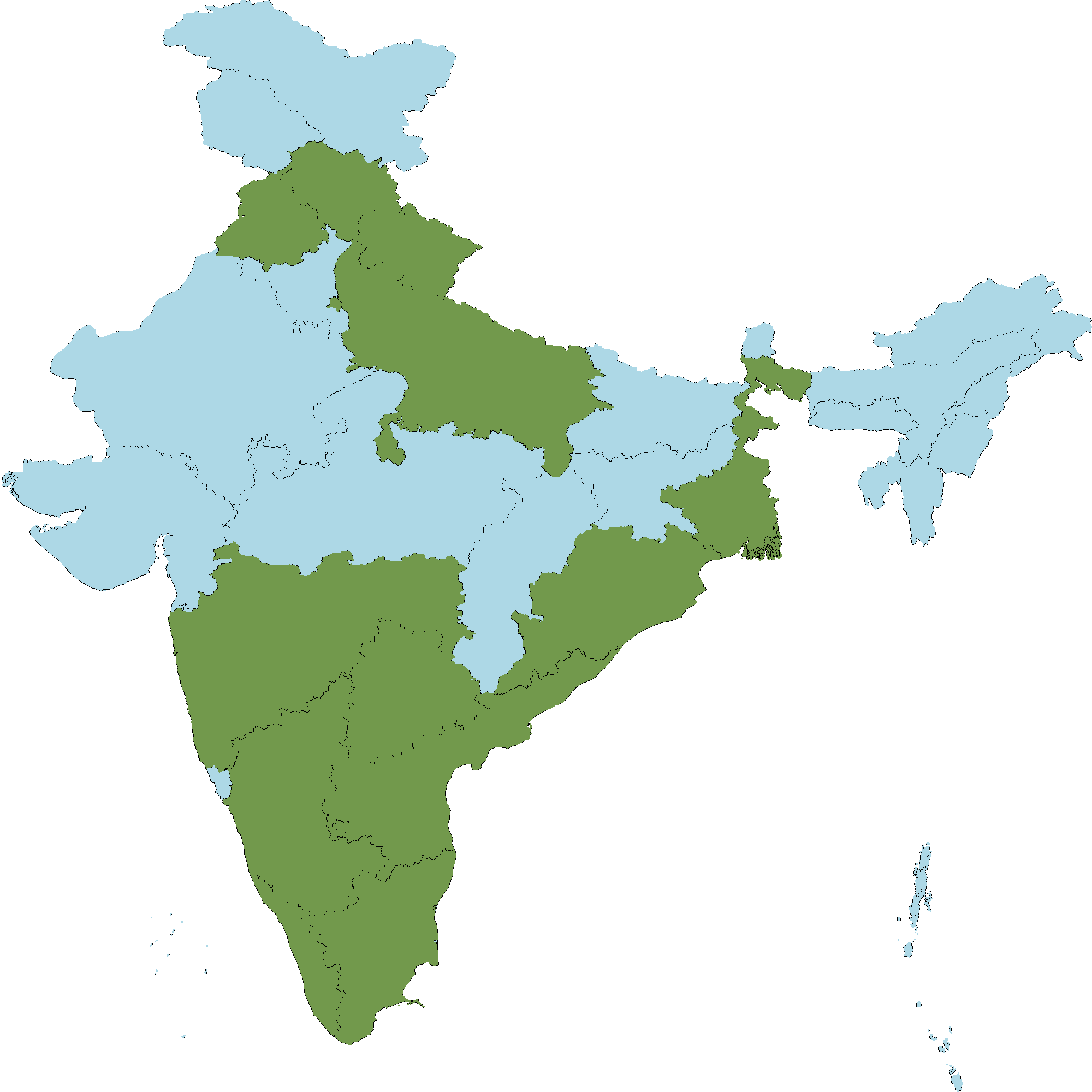 - Andhra Pradesh : Anantapur district, Chittoor district, Kadapa district, East Godavari district, Guntur district, Krishna district, Kurnool district, Nellore district, Prakasam district, Srikakulam district, Vishakapatnam district, Vizianagaram district, West Godavari district