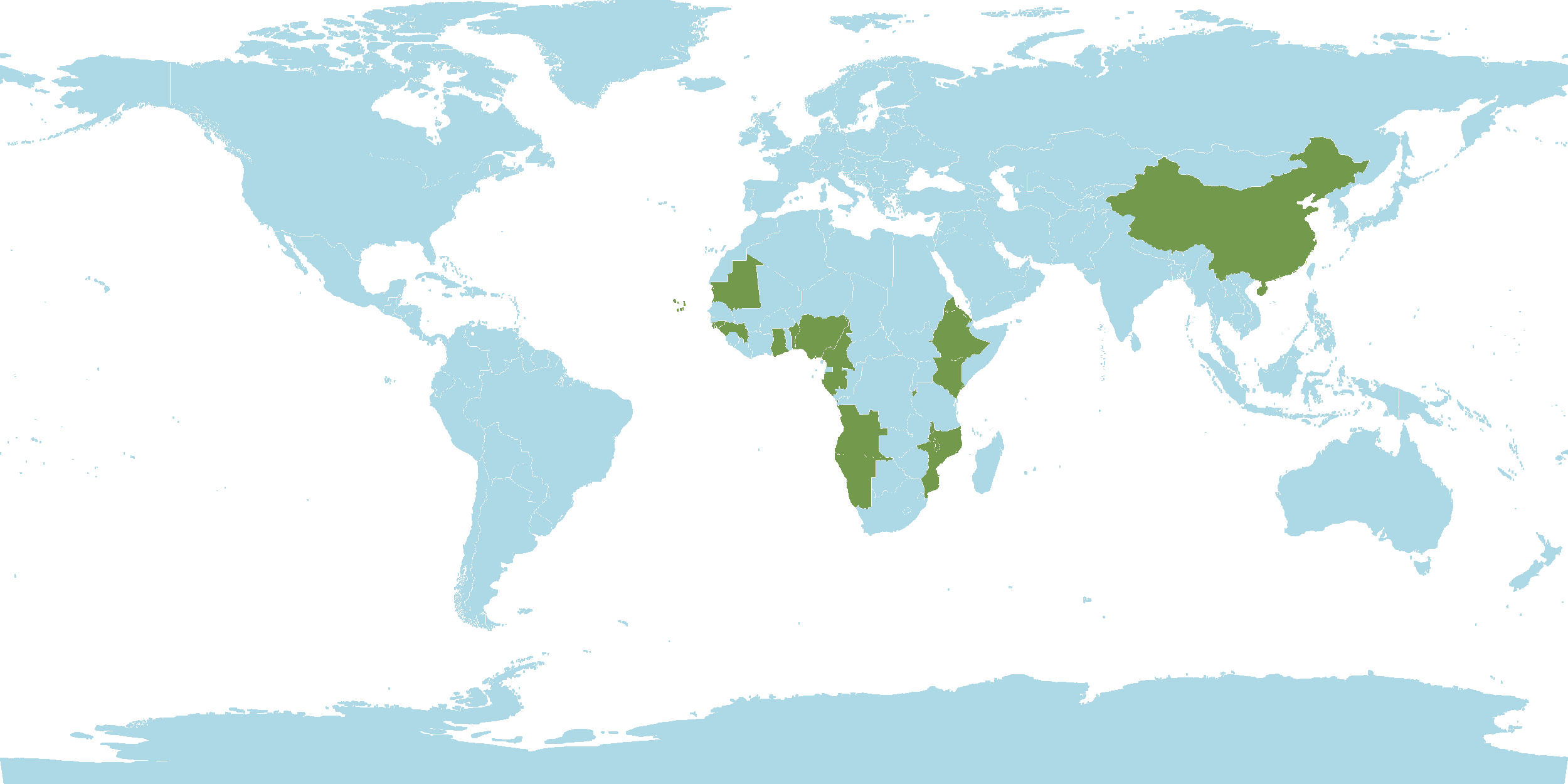 - Native : Angola, Benin, Burkina, Burundi, Cameroon, Cape Verde, Caprivi Strip, Central African Repu, China, Eritrea, Ethiopia, Gabon, Gambia, Ghana, Guinea, Guinea-Bissau, Gulf of Guinea Islands, Hainan, Kenya, Malawi, Mauritania, Mozambique, Namibia, Nigeria, Nor