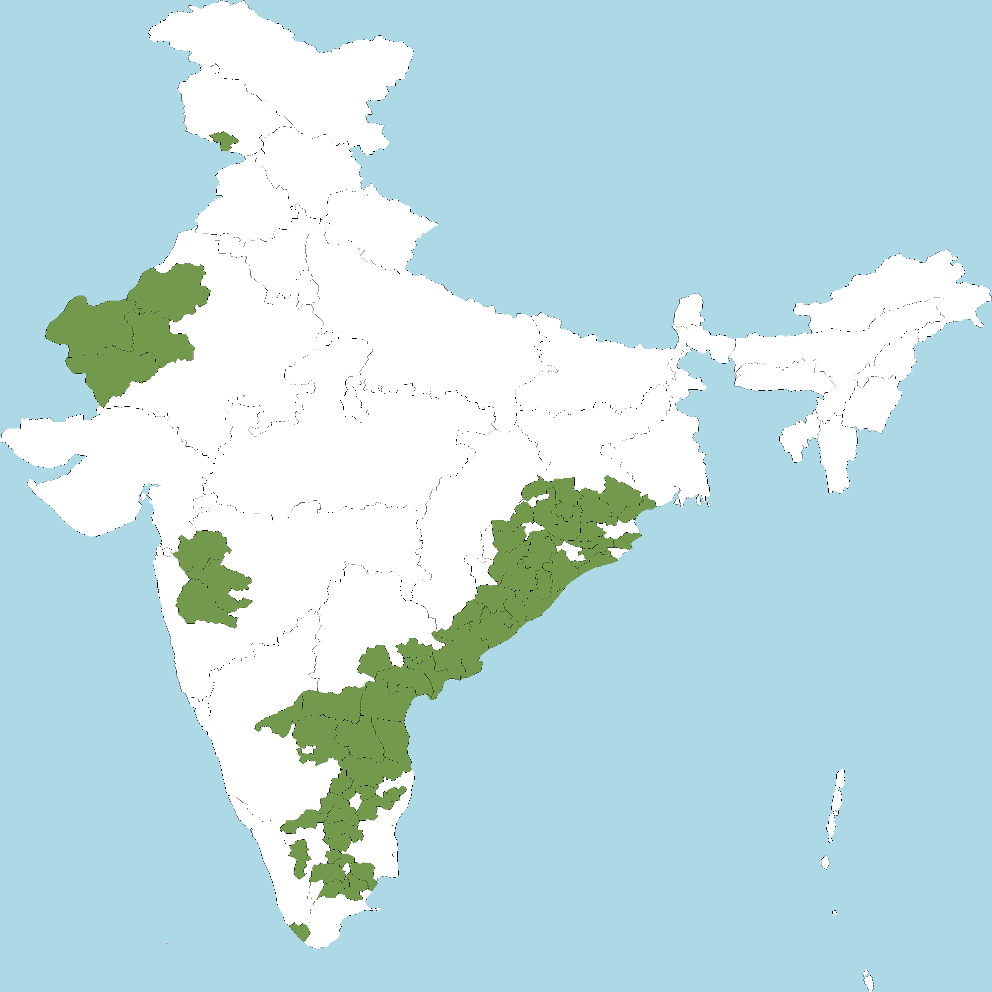 - Andhra Pradesh : Anantapur district, Chittoor district, Y.S.R. Kadapa district, East Godavari district, Guntur district, Krishna district, Kurnool district, S.P.S. Nellore district, Prakasam district, Srikakulam district, Visakhapatnam district, Vizianagaram district, West Godavari district