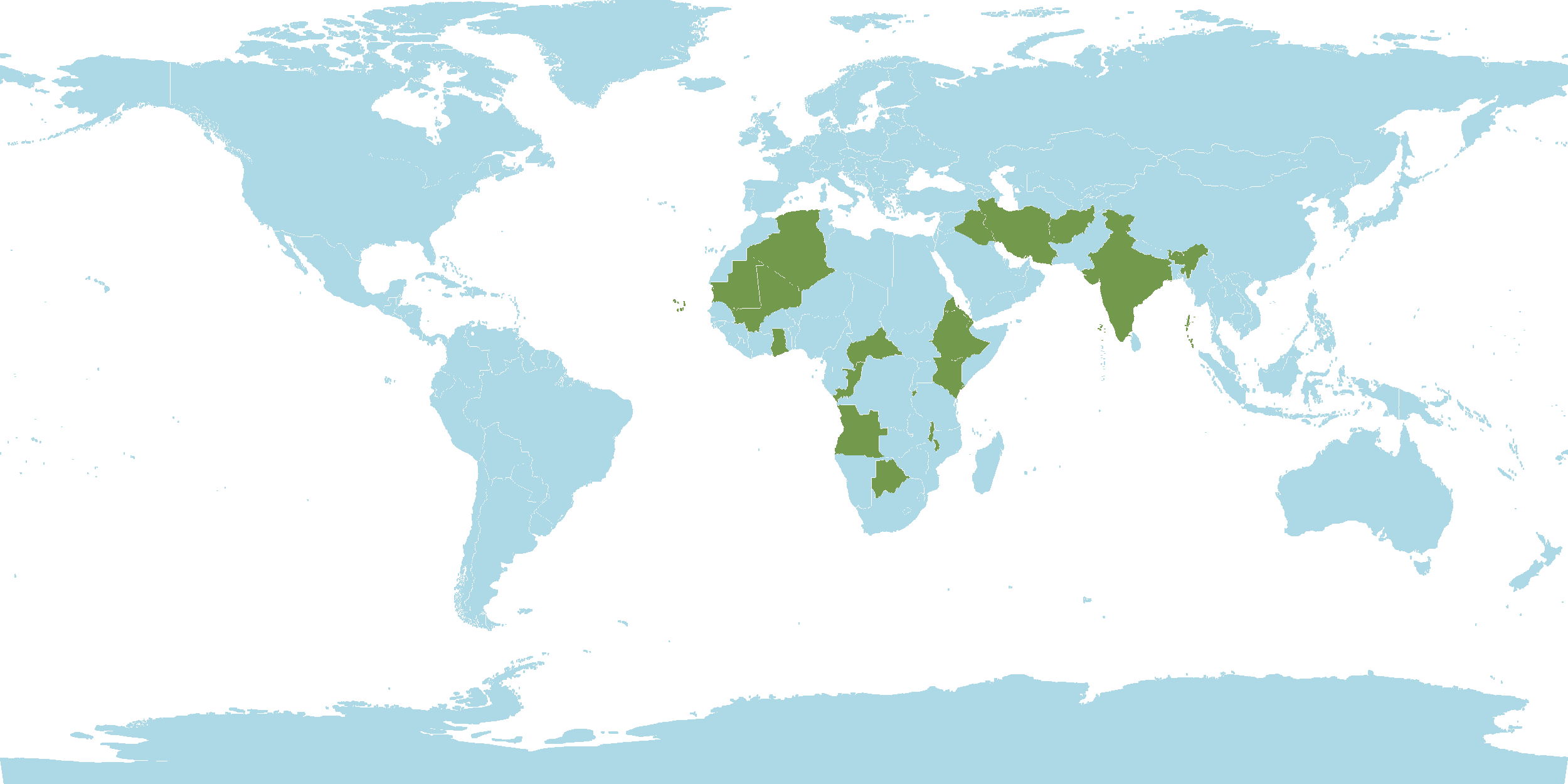 - Native : Afghanistan, Algeria, Angola, Bhutan, Botswana, Burundi, Cape Provinces, Cape Verde, Central African Republic, Congo, Djibouti, Eritrea, Ethiopia, Ghana, Gulf States, India, Iran, Iraq, Kenya, KwaZulu-Natal, Lakshadweep Islands, Malawi, Mali, Mauritania,