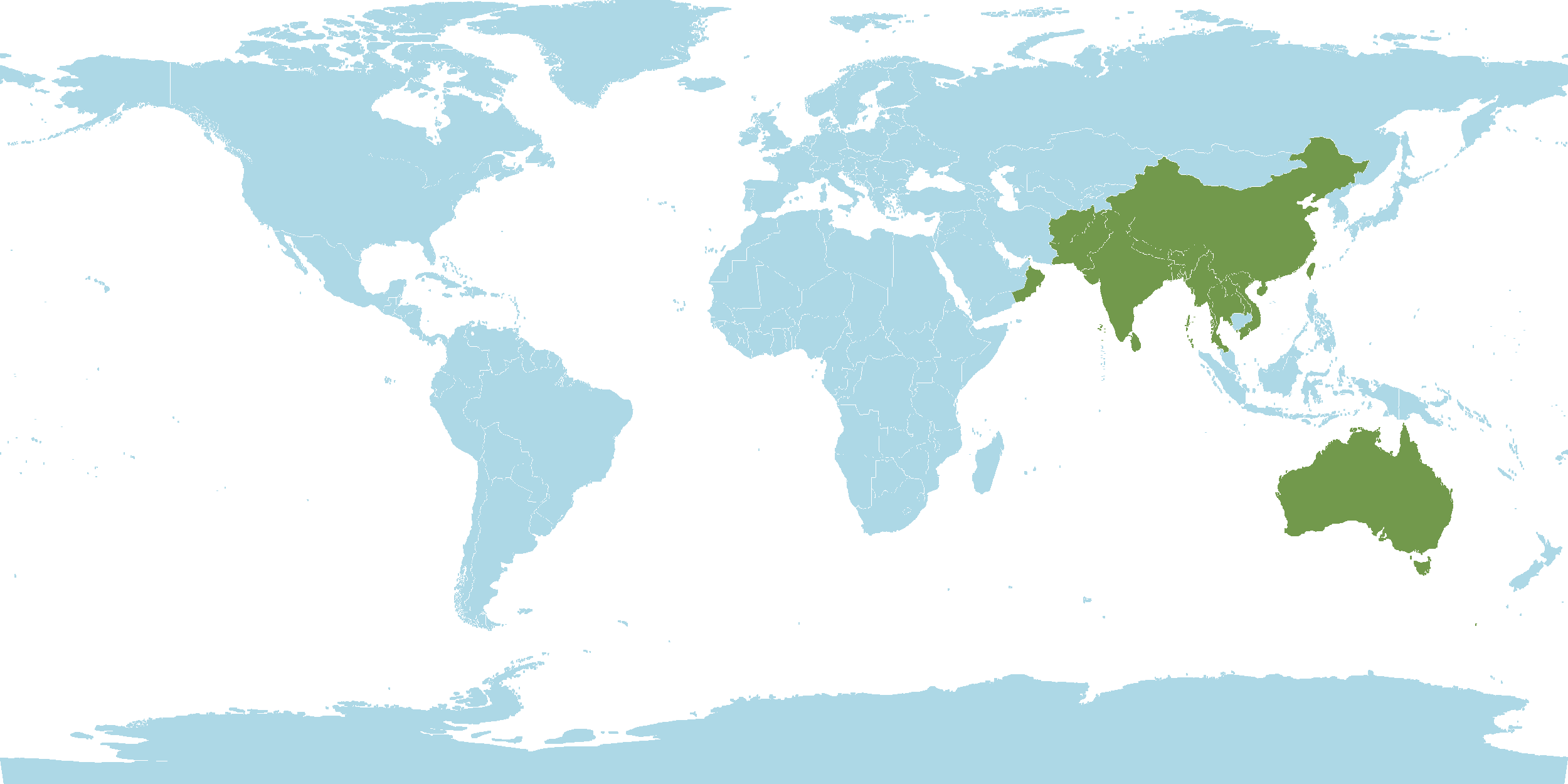 - World Distribution : Afghanistan, Australia, Bangladesh, Bhutan, China, Gulf States, India, Jawa, Lakshadweep Islands, Laos, Lesser Sunda Islands, Myanmar, Nepal, New Guinea, Oman, Pakistan, Sri Lanka, Taiwan, Thailand, Vietnam