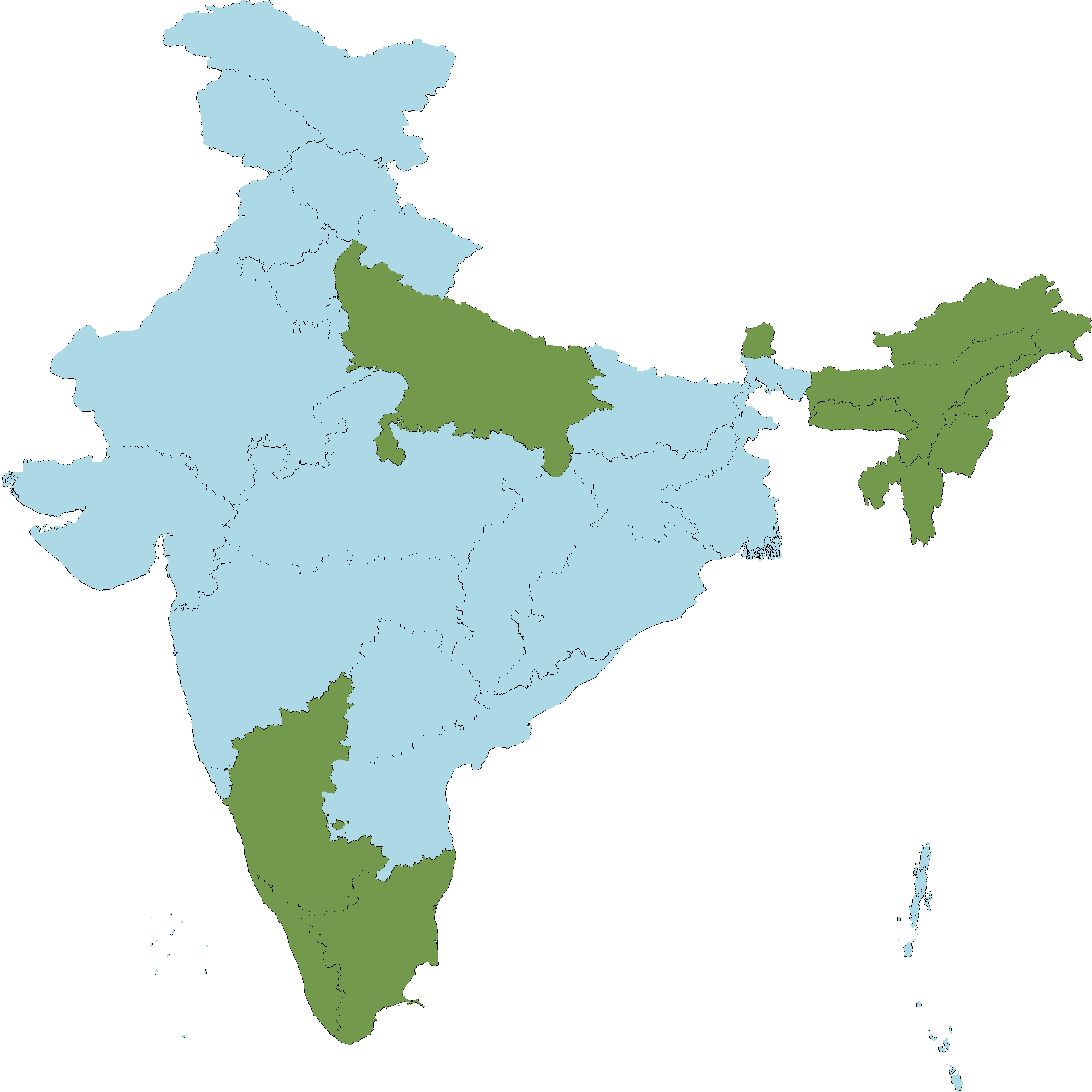 - Kerala : Kannur district, Wayanad district, Malappuram district, Palakkad district, Idukki district, Kottayam district, Pathanamthitta district, Kollam district