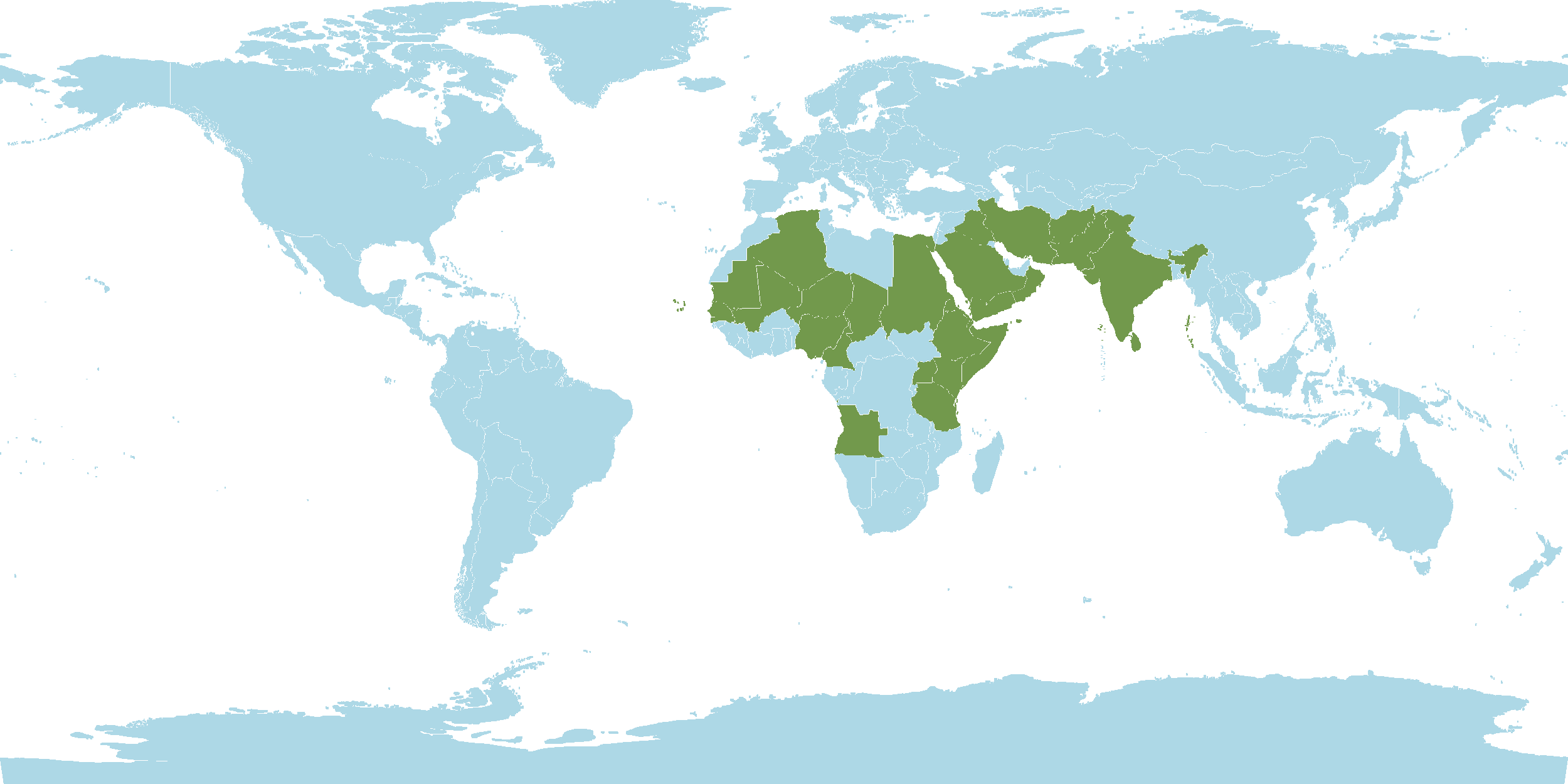 - Native : Afghanistan, Algeria, Angola, Burkina, Cameroon, Cape Verde, Chad, Djibouti, Egypt, Eritrea, Ethiopia, Gulf States, India, Iran, Iraq, Kenya, Lebanon-Syria, Mali, Mauritania, Niger, Nigeria, Oman, Pakistan, Palestine, Saudi Arabia, Senegal, Sinai, Socotra