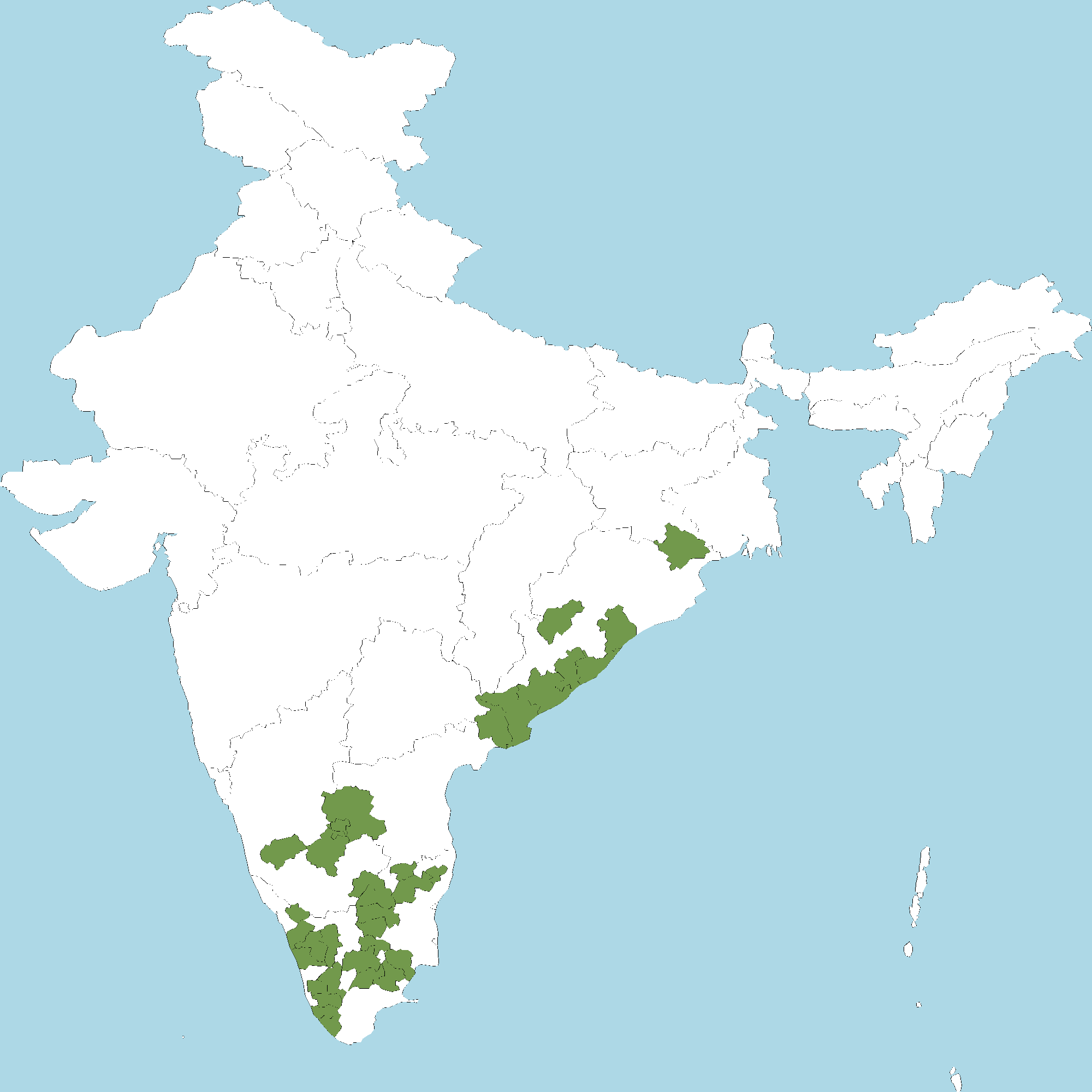 - Kerala : Wayanad district, Malappuram district, Palakkad district, Thrissur district, Idukki district, Kottayam district, Pathanamthitta district, Kollam district, Thiruvananthapuram district