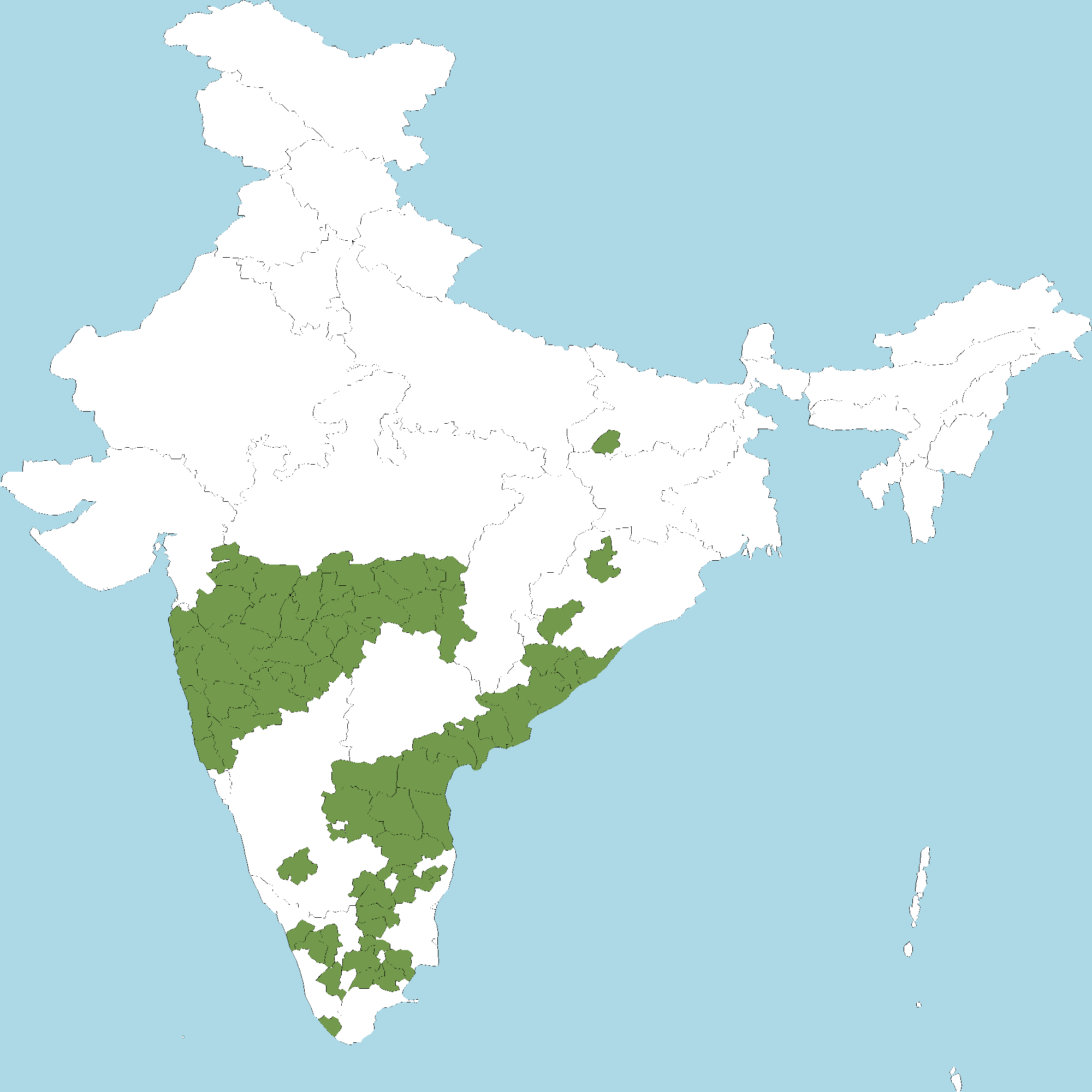 - Andhra Pradesh : Anantapur district, Chittoor district, Y.S.R. Kadapa district, East Godavari district, Guntur district, Krishna district, Kurnool district, S.P.S. Nellore district, Prakasam district, Srikakulam district, Visakhapatnam district, Vizianagaram district, West Godavari district