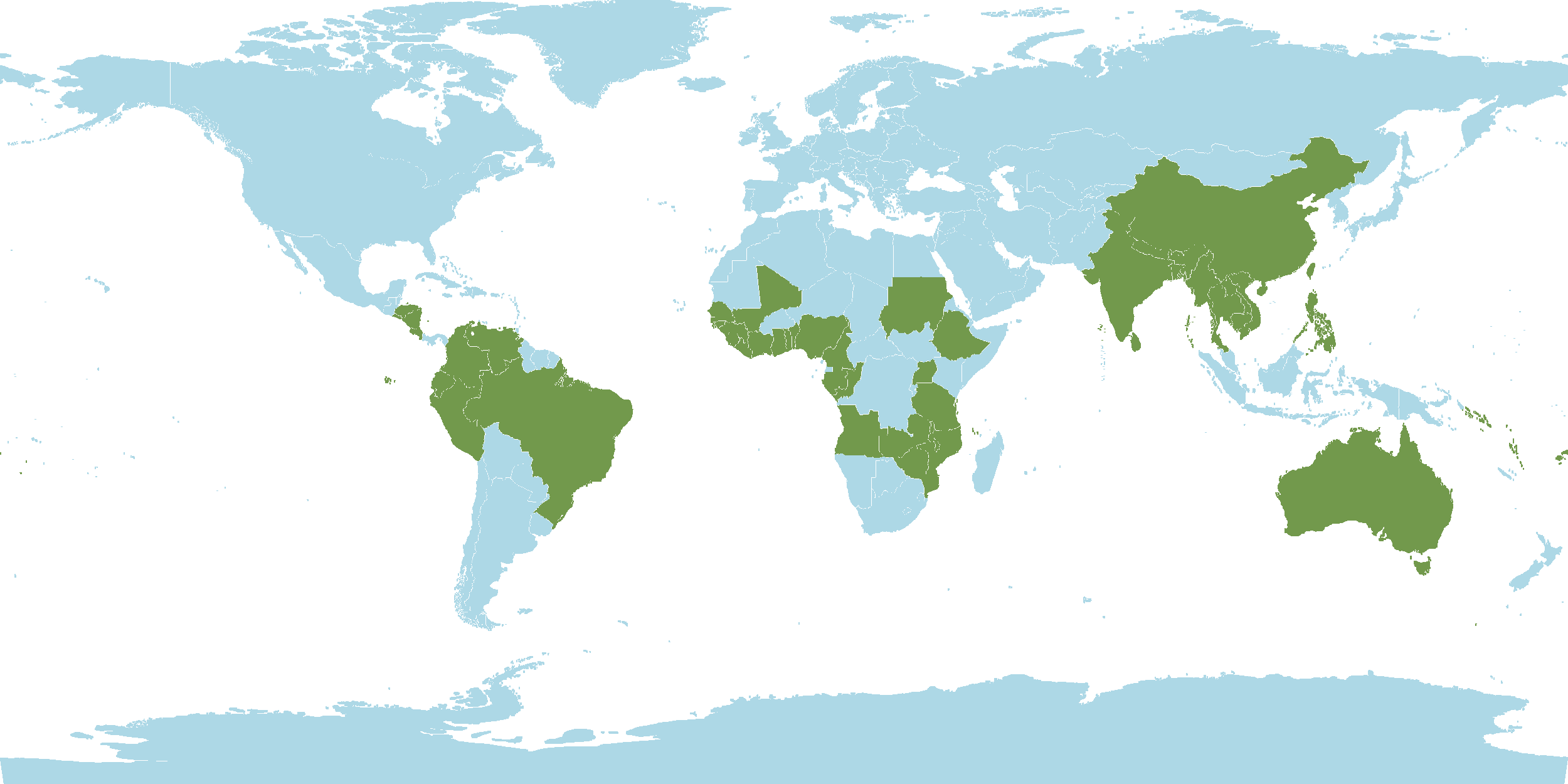 - World Distribution : Angola, Australia, Bangladesh, Benin, Bhutan, Borneo, Brazil, Burkina, Cambodia, Cameroon, Central African Repu, China, Colombia, Comoros, Congo, Costa Rica, Ecuador, El Salvador, Ethiopia, Fiji, Gabon, Gambia, Ghana, Guinea, Guinea-Bissau, Gulf of Guinea Islands, Hainan, Honduras, India, Ivory Coast, Jawa, Laos, Lesser Sunda Islands, Liberia, Malawi, Malaya, Mali, Maluku, Mozambique, Myanmar, Nepal, New Guinea, Nicaragua, Nicobar Islands, Nigeria, Panamá, Peru, Philippines, Samoa, Senegal, Sierra Leone, Solomon Islands, Sri Lanka, Sudan, Sulawesi, Sumatera, Taiwan, Tanzania, Thailand, Togo, Tonga, Uganda, Vanuatu, Venezuela, Vietnam, Zambia, Zaïre, Zimbabwe